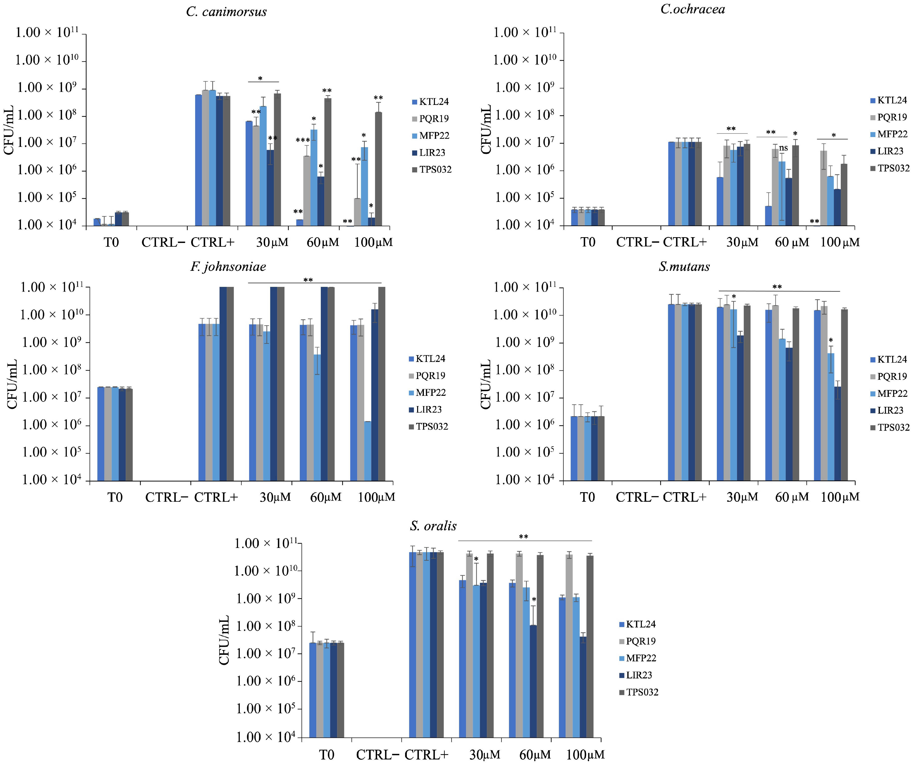 S. oralis, no MBC values were observed. However, a dose-dependent trend for LIR23 and MFP22 was evident. In particular, at 100 µM, LIR23 reduced CFU/mL counts of