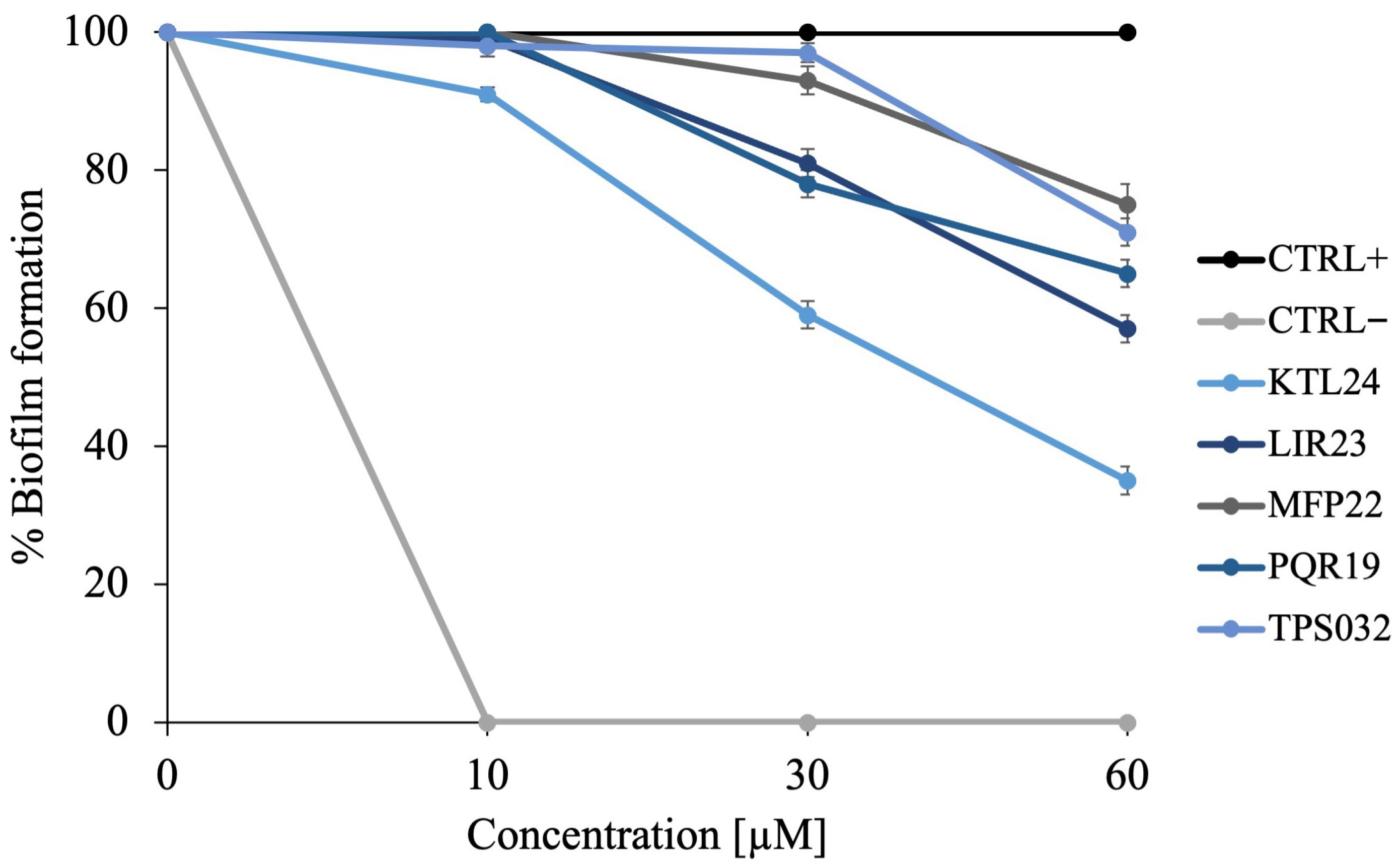 Figure 2A), at 60 µM of KTL24 and LIR23, the spots exhibited few colony formations, indicating an antimicrobial potential. Indeed, at 100 µM, complete inhibition of bacterial growth was observed. Conversely, colony formation was still visible for 100 µM of TPS032, PQR19 and MFP22.