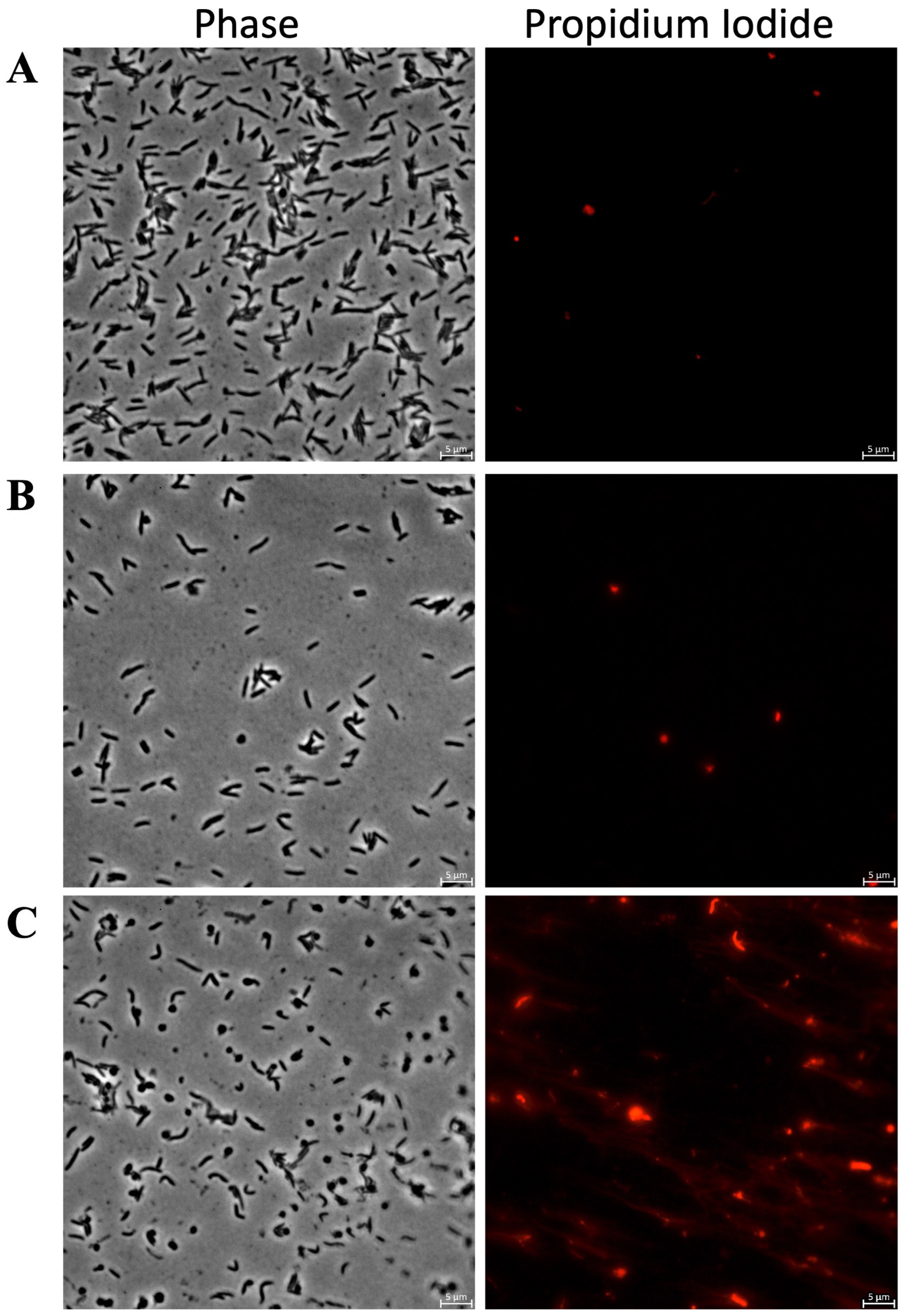 At the morphological level, strains treated with LIR23 and MFP22 exhibited clear structural alterations, such as a shift from rod-shaped to spherical morphology, particularly in C. canimorsus and F. johnsoniae. This further supports a direct effect on bacterial cell structures. Such changes were not observed in Gram (+) strains, consistent with the lower antimicrobial activity observed. Nevertheless, in Gram (+) strains, LIR23 and MFP22 also induced inner membrane damage, while KTL24 caused no appreciable membrane disruption.