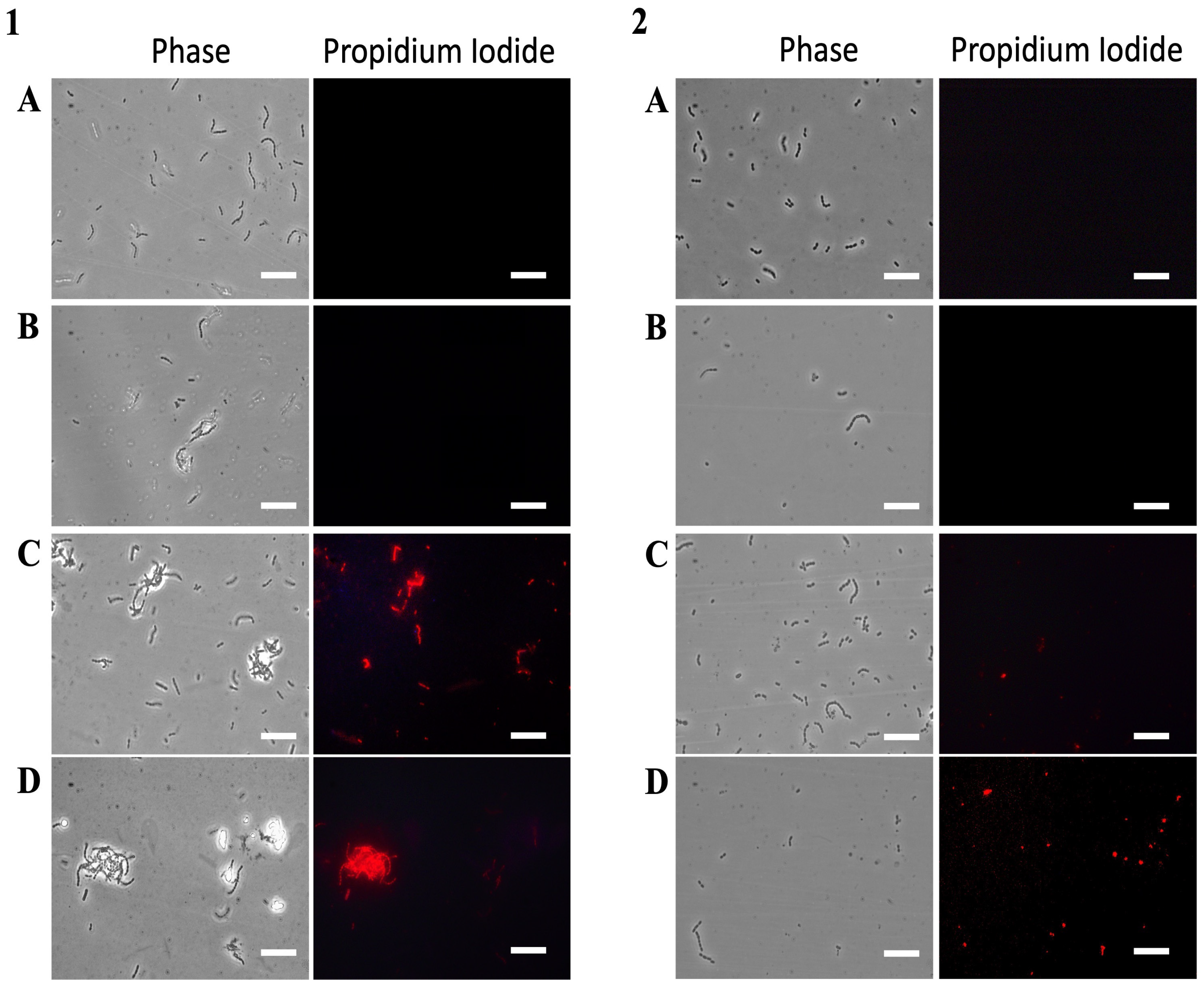 Figure 5B) results in reduced viability, as shown by the increase in red fluorescence (PI), although part of the biofilm structure remains intact. In contrast, the peptide KTL24 (