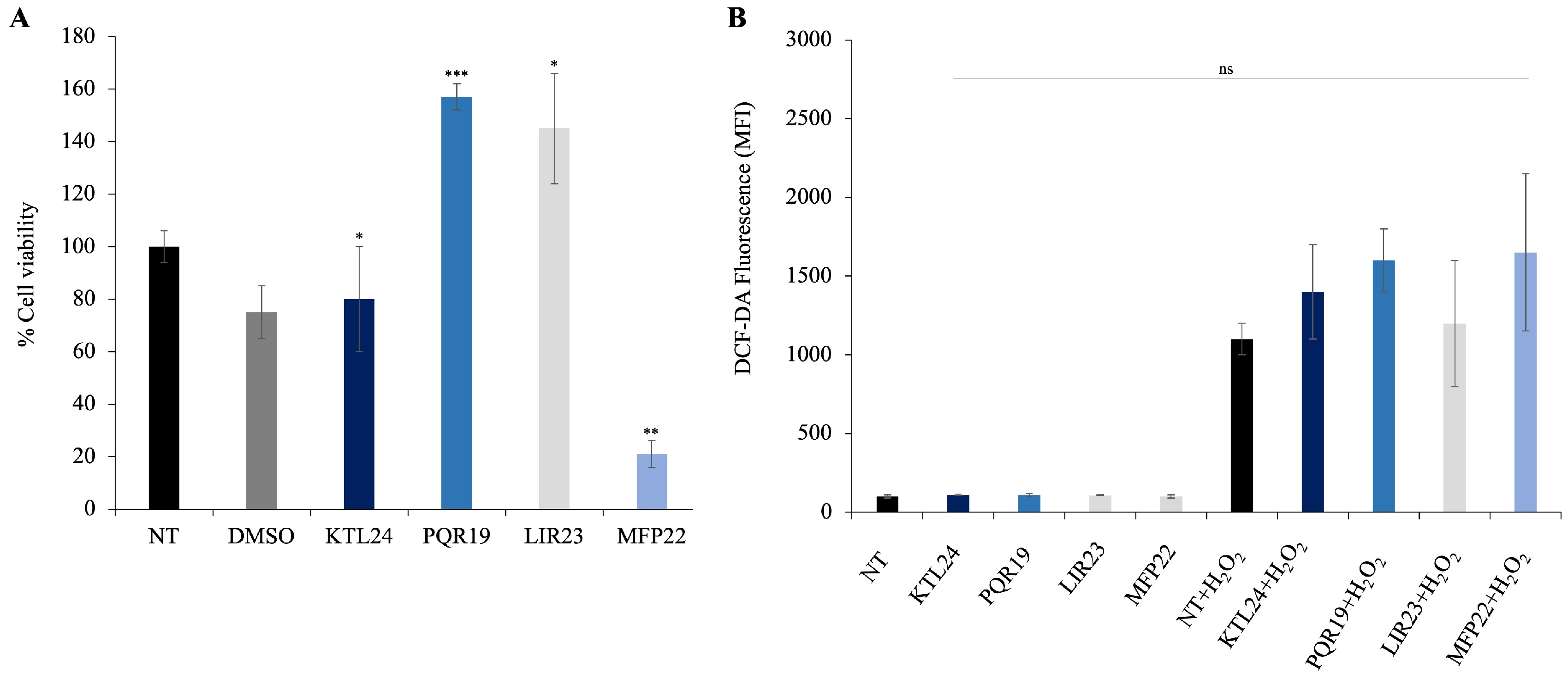 4 of HaCaT cells were seeded in a 96-well plate. After 24 h, the culture media were changed with fresh DMEM without phenol red supplemented with 10% FBS and with KTL24, PQR19, LIR23 or MFP22 at a final concentration of 100 μM/well, with or without H