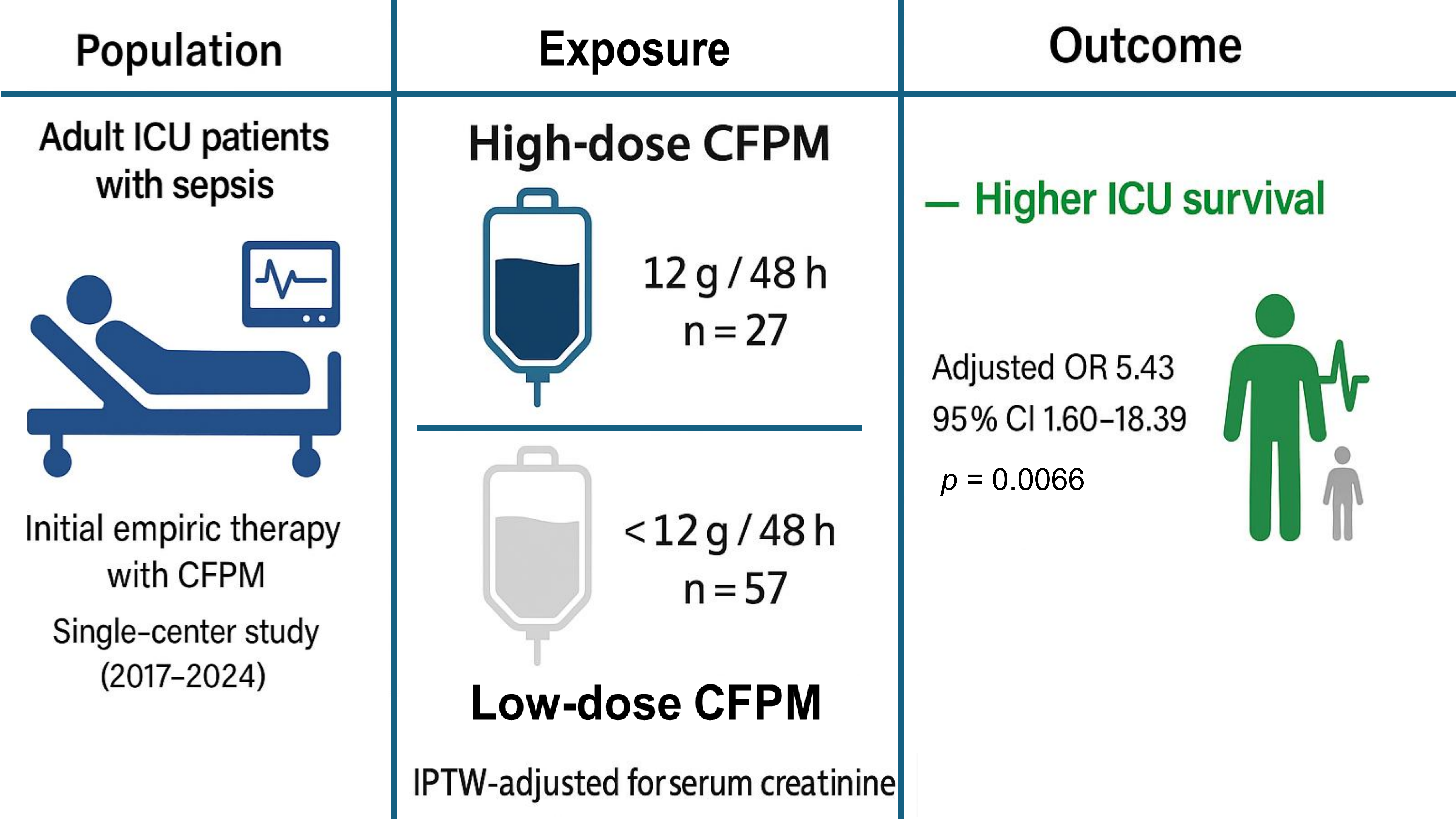 Chicago/Turabian StyleKuwana, Tsukasa, Kosaku Kinoshita, Yuma Kanai, Yurina Yamaya, Ken Takahashi, Satoshi Ishizuka, and Toru Imai. 2026. "Impact of High-Dose Cefepime During the Initial 48 h on Intensive Care Unit Survival in Sepsis: A Retrospective Observational Study" Antibiotics 15, no. 1: 88. https://doi.org/10.3390/antibiotics15010088