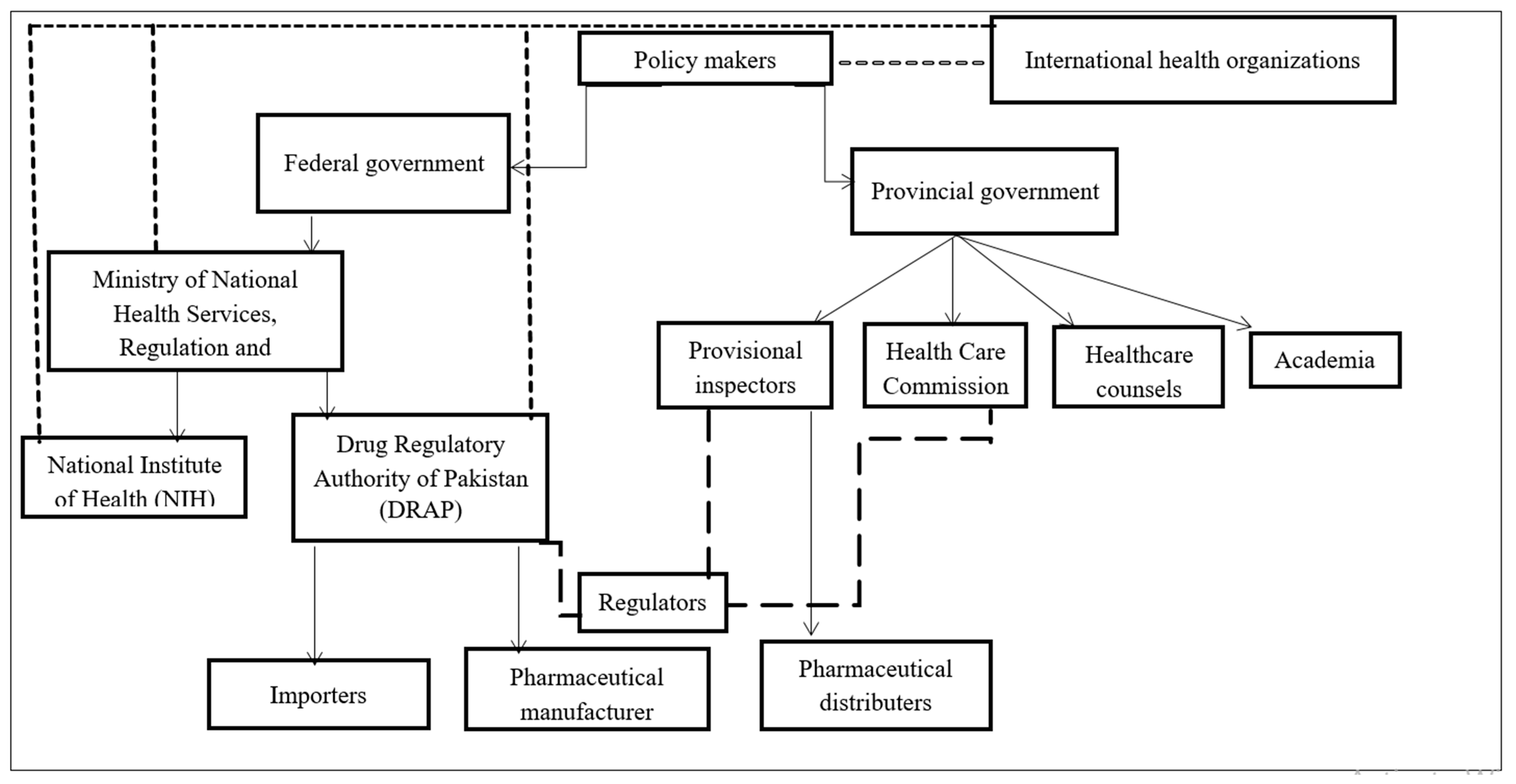 “Major focal point for AMR in Pakistan is NIH, which is working in collaboration with health departments, regulatory bodies, federal (DRAP), provincial), hospitals, and academia for controlling AMR. DRAP deals with the AMC component (the NIH’s role is collaborative), i.e., the import, manufacturing, distribution, and sale of antimicrobials. The mandate of international health organizations working in Pakistan is to collaborate with national and provisional bodies and assist them, such as providing training sessions, and other matters.”(Pharmaceutical policy and practice expert-I)