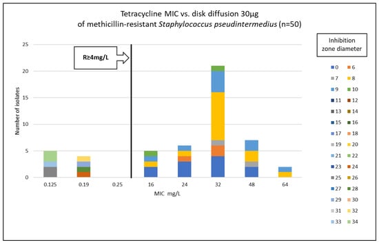 Correlation between tetracycline MIC values and inhibition zone diameters of methicillin-resistant Staphylococcus pseudintermedius (n = 50).