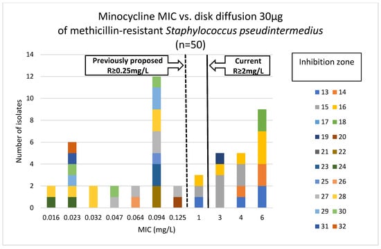 Correlation between minocycline MIC values and inhibition zone diameters of methicillin-resistant Staphylococcus pseudintermedius (n = 50).