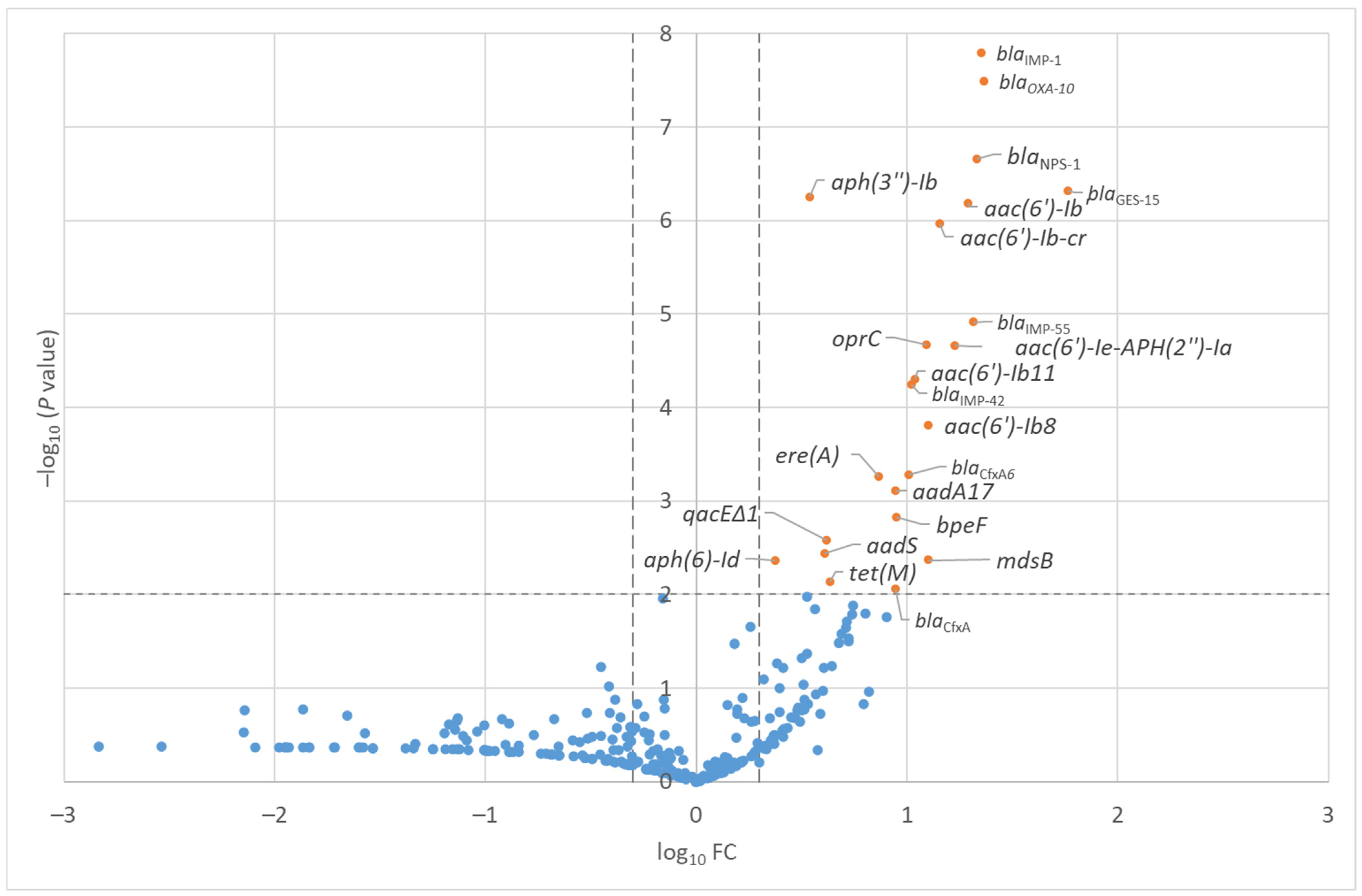 Table 1. List of antimicrobial resistant genes with significantly higher RPKM (−log10 p-value > 2.0 and log10 FC > 0.3) in the hospital samples compared with the shopping mall samples.