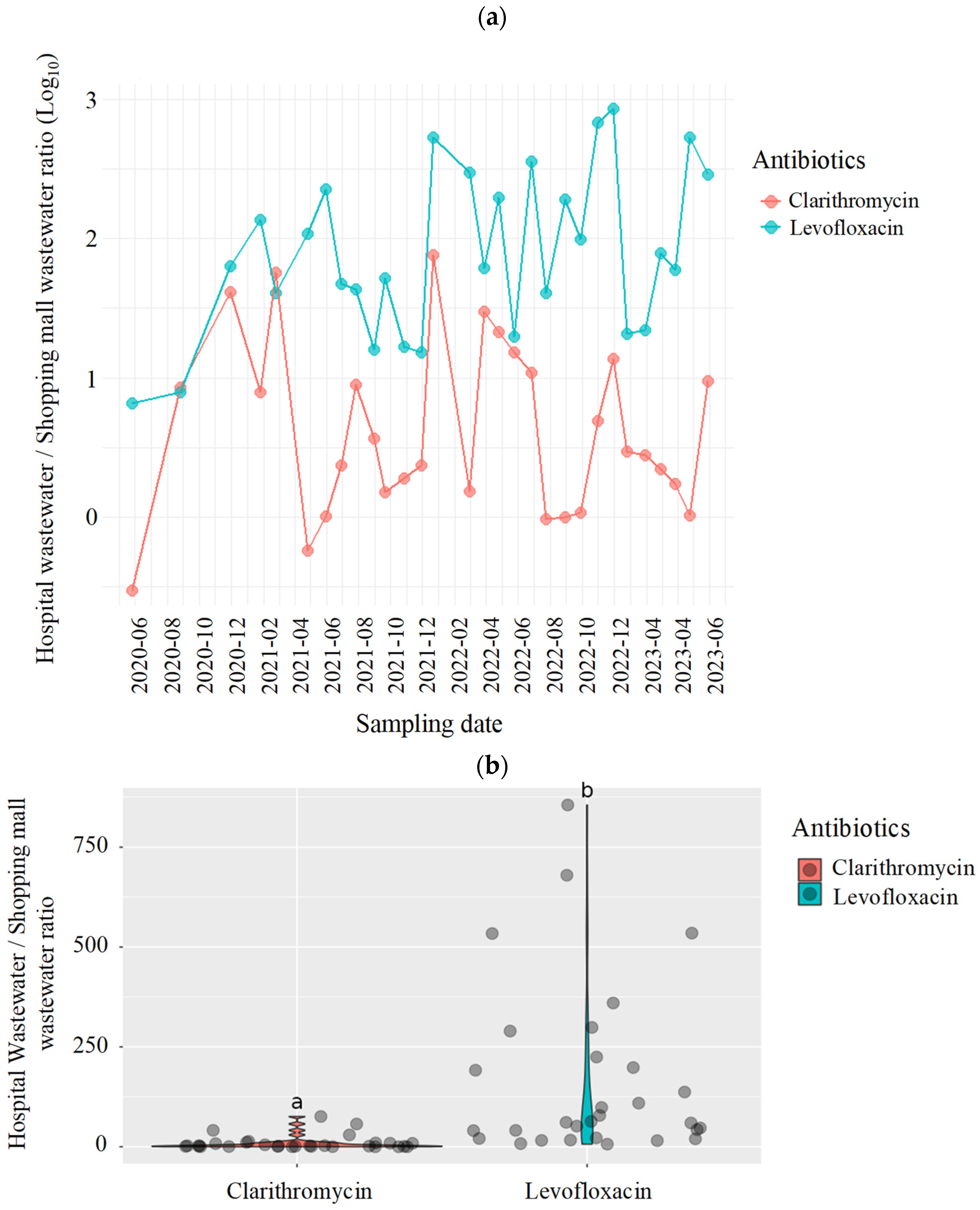 Figure 2. (a) Temporal variations in the concentration ratios and (b) distribution of the concentration ratios of clarithromycin and levofloxacin from June 2020 to June 2023. Different characters within the violin plot (a and b) indicate significant differences between groups. (p < 0.05).