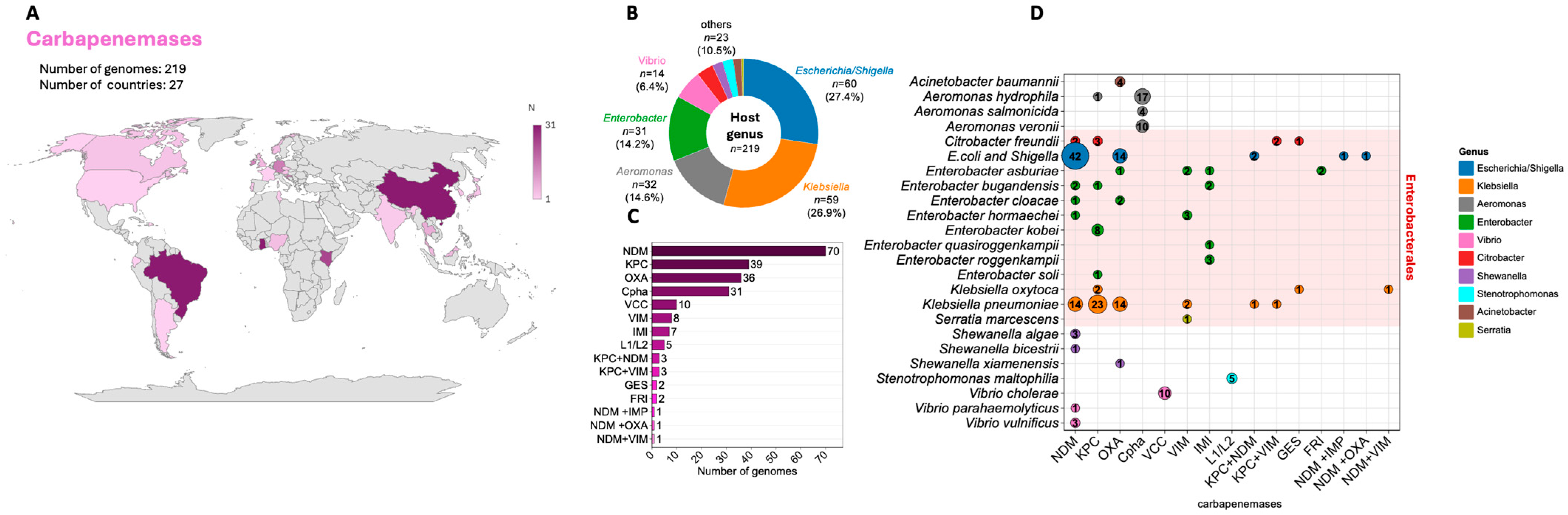 - Darya, B.B.; Mor, L.-W.; Reut, E.E.; Sivan, L.S.; Elizabeth, T.; David, S.; Alona, K.-P.; Yehuda, C. Plasmid-Encoded VCC-1 β-Lactamase in a Clinical Isolate of Aeromonas Caviae. Antimicrob. Agents Chemother. 2023, 67, e00707-23. [Google Scholar] [CrossRef]