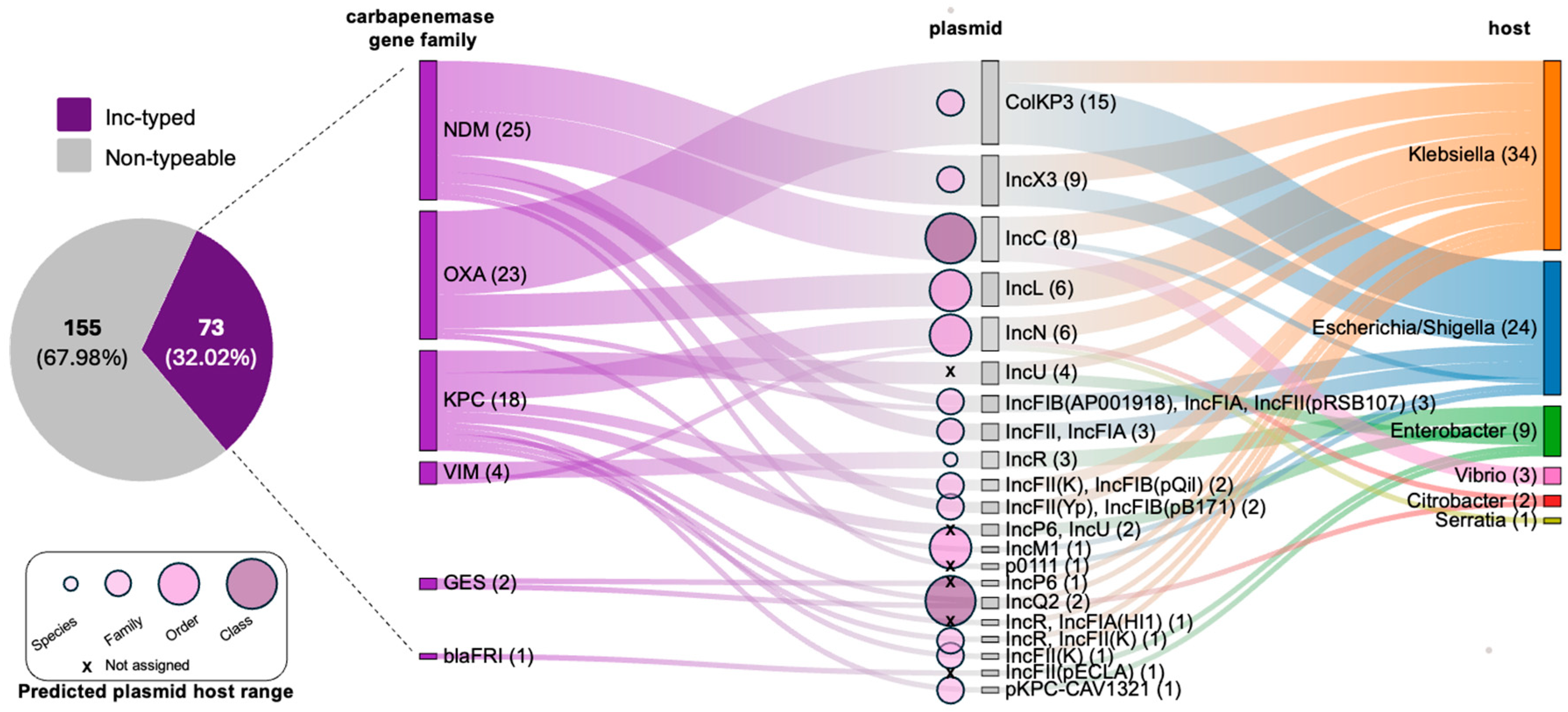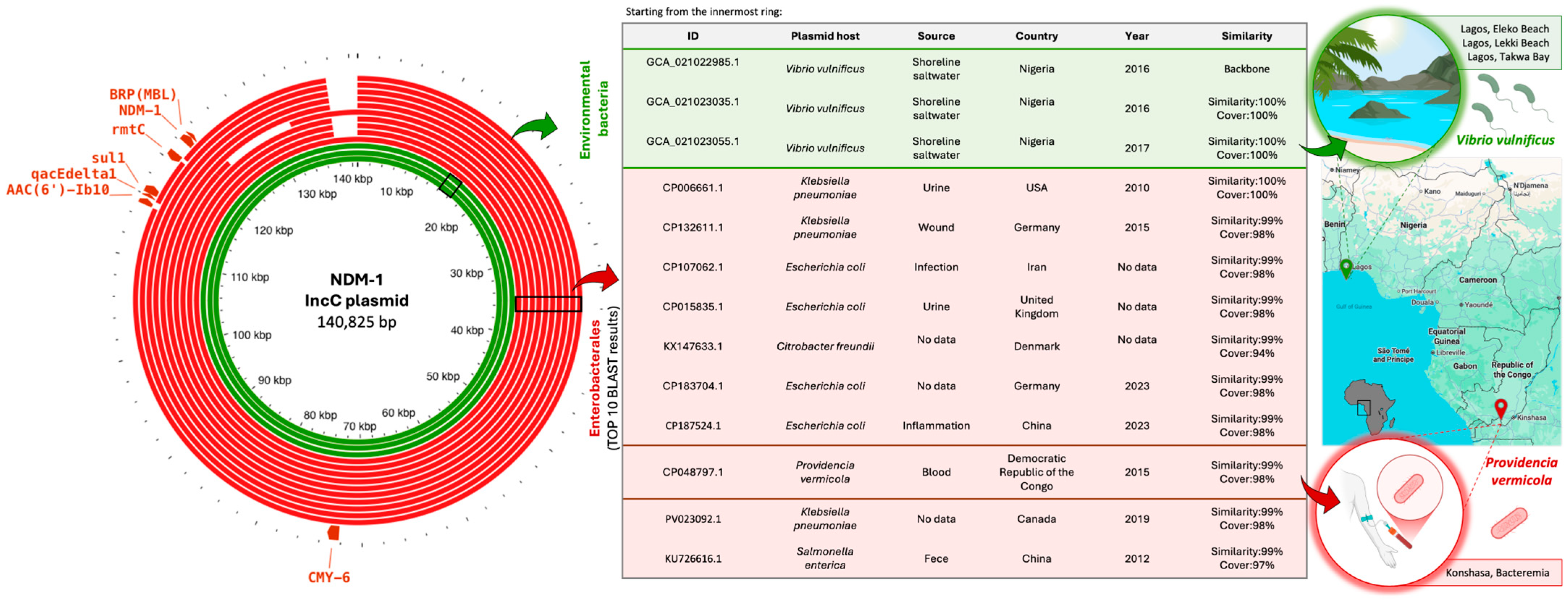 - Ju, X.; Xiong, P.; Yan, Z.; Chen, G.; Cai, C.; Zhang, R. Emergence of Carbapenem-resistant Citrobacter spp. across Human, Animal, and Water Environments in China. Int. J. Antimicrob. Agents 2025, 65, 107463. [Google Scholar] [CrossRef] [PubMed]