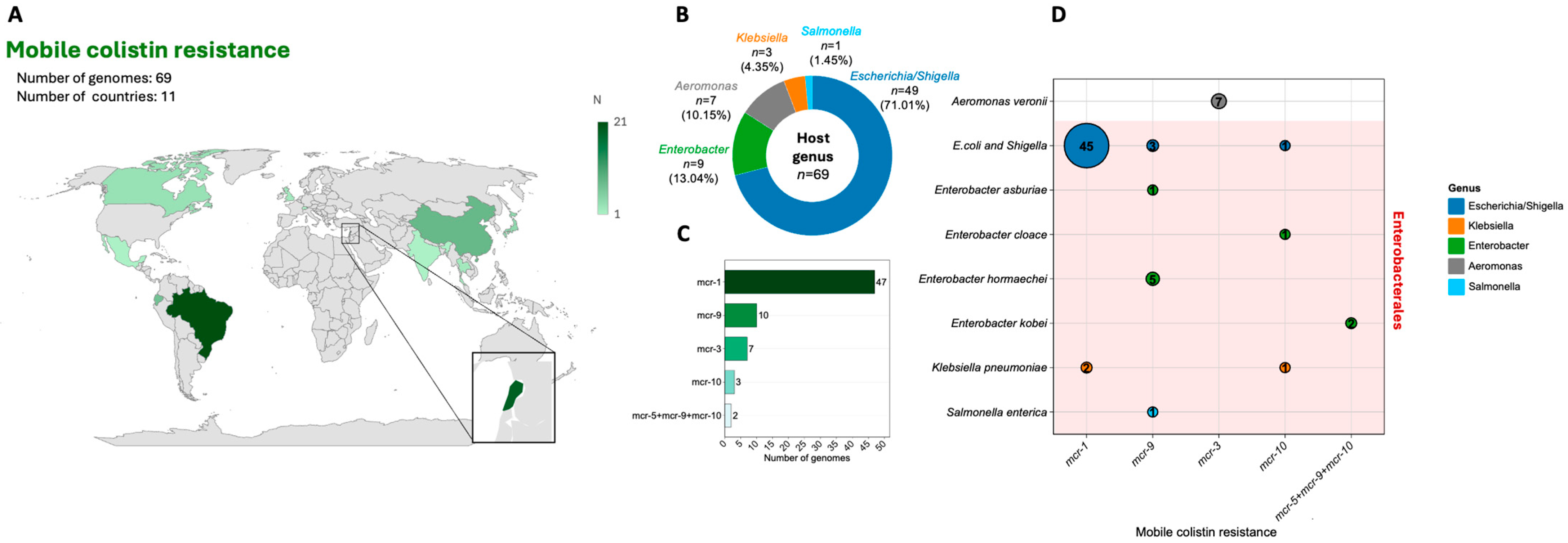 - Gashaw, Y.; Asmare, Z.; Tigabie, M.; Sisay, A.; Getatachew, E.; Tadesse, S.; Bitew, G.; Ashagre, A.; Misganaw, T.; Gashaw, M.; et al. Prevalence of Colistin-Resistant Enterobacteriaceae Isolated from Clinical Samples in Africa: A Systematic Review and Meta-Analysis. BMC Infect. Dis. 2025, 25, 437. [Google Scholar] [CrossRef] [PubMed]