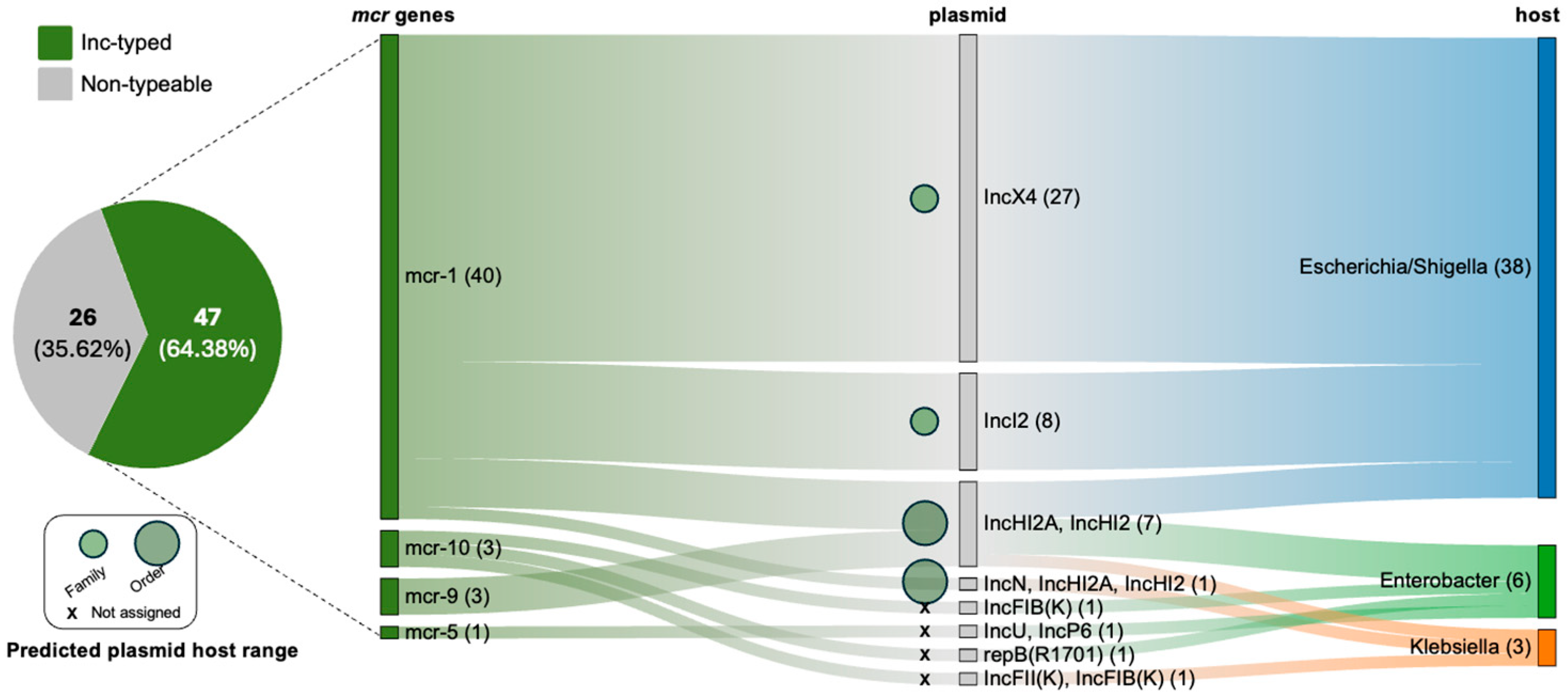 - Tatsuya, N.; Shiori, Y.; Natsuki, O.; Takahiro, Y.; Michio, J.; Nguyen, M.D.T.; Nguyen, H.O.; Le, T.H.; Ngo, T.P.; Hoang, H.P.; et al. IncHI2 Plasmid Encoding BlaCTX-M-55 and Mcr-1.1 in Salmonella enterica SE20-C72-2 and Escherichia coli EC20-C72-1 Isolates from the Edible River Fish Anabas Testudineus. Microbiol. Resour. Announc. 2023, 12, e00149-23. [Google Scholar] [CrossRef]