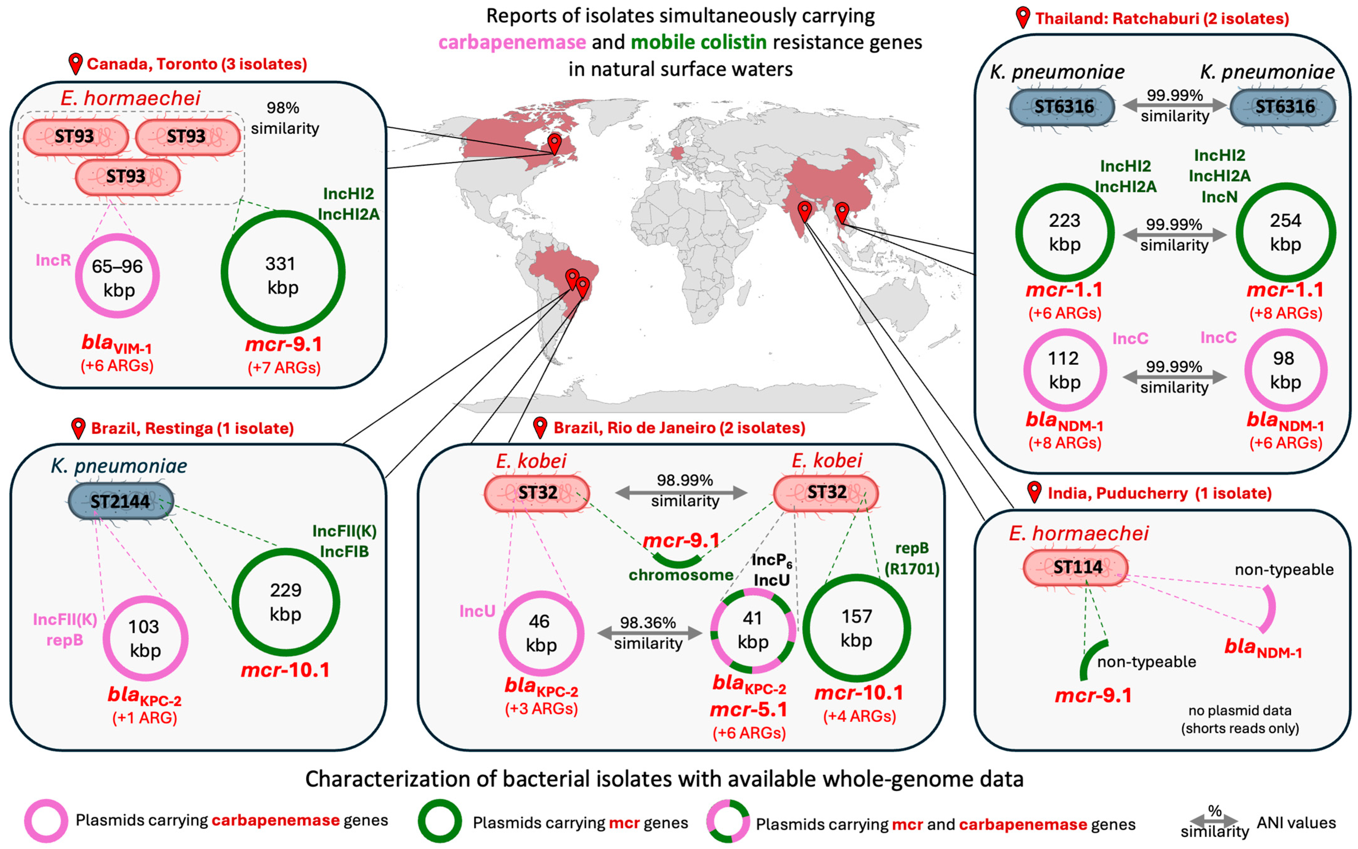 | Enterobacter kobei | Coastal Water | 2014 | Brazil: Rio de Janeiro | blaKPC-2 | mcr-9.1 mcr-5.1 mcr-10.1 | 1 | WGS | GCA_024623675.1 | [129] |