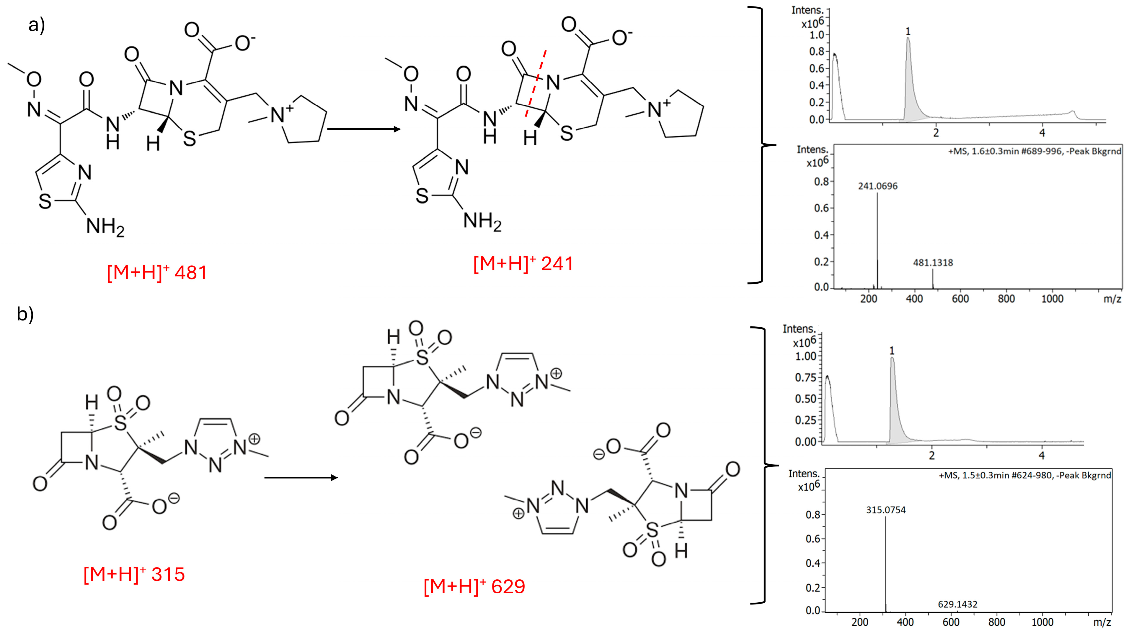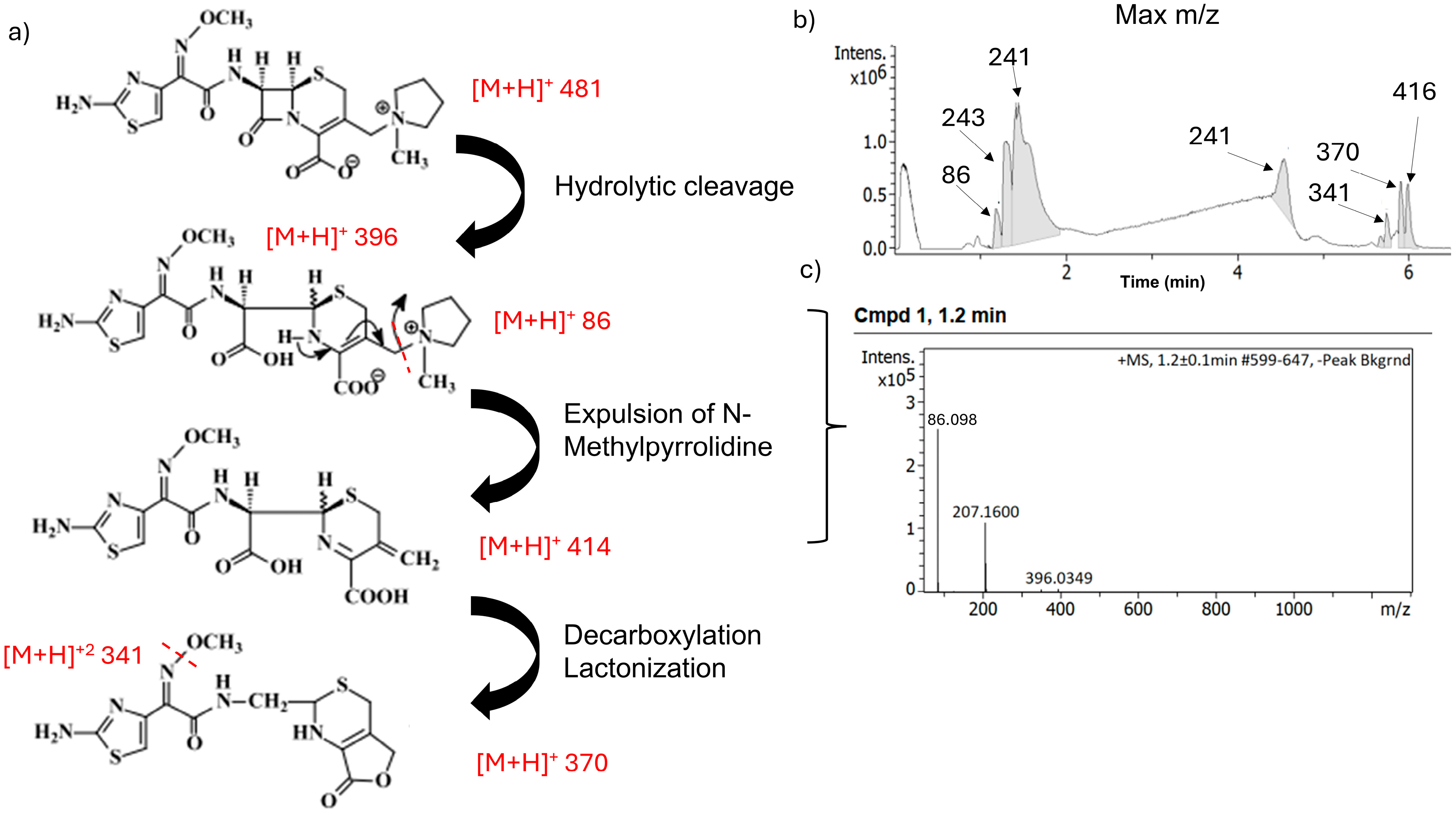 - Jagadeesh Kumar, V.; Badarinadh Gupta, P.; Pavan Kumar, K.S.; Prasada Rao, K.V.; Rao, K.R.; Prasanna, S.J.; Kumar Sharma, H.; Mukkanti, K. Identification and characterization of new degradation products of cefepime dihydrochloride monohydrate drug substance during stress stability studies. Anal. Sci. 2010, 26, 1081–1086. [Google Scholar] [CrossRef] [PubMed][Green Version]