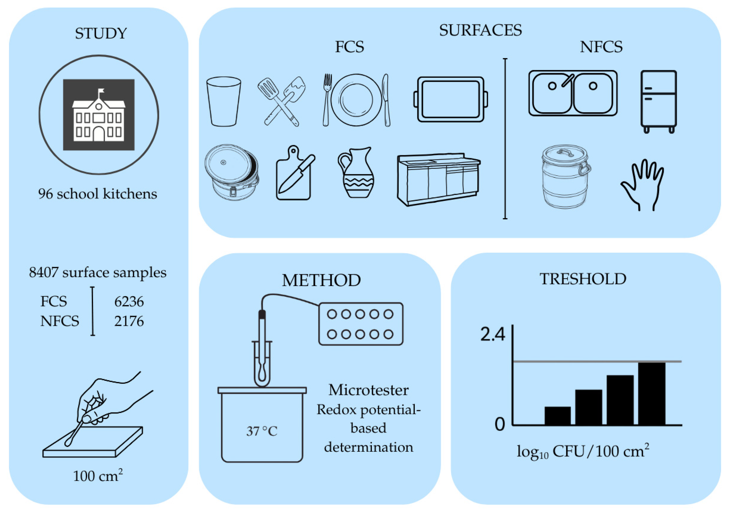 - Illés, C.B.; Tóth, A.J.; Dunay, A.; Lehota, J.; Bittsánszky, A. Evaluation of Food Safety Knowledge and Microbial Status of Food Contact Surfaces in Schools. J. Food Saf. 2018, 38, e12480. [Google Scholar] [CrossRef]
