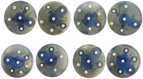 ESBL production was phenotypically evaluated using the double-disk synergy test (DDST), a well-established confirmatory method for detecting clavulanate- or tazobactam-inhibitable β-lactamases. In this assay, disks containing selected extended-spectrum cephalosporins were placed at a standardized distance from disks containing β-lactam/β-lactamase inhibitor combinations (amoxicillin–clavulanate or piperacillin–tazobactam) on Mueller–Hinton agar. Enhancement or distortion of the inhibition zone of the cephalosporin disk toward the inhibitor disk was interpreted as positive synergy, indicating ESBL activity (Figure 1).