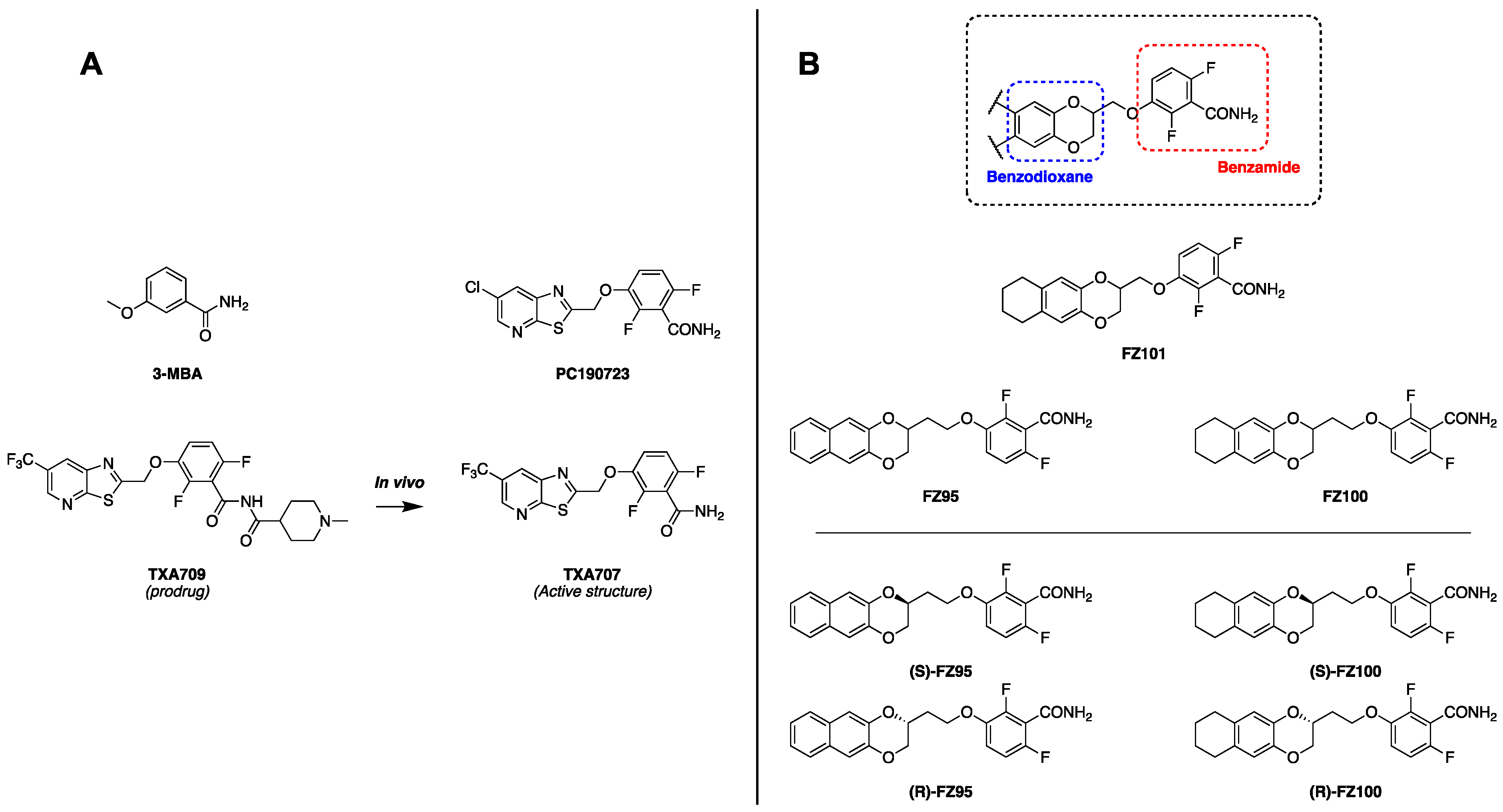 - Kaul, M.; Mark, L.; Zhang, Y.; Parhi, A.K.; Lyu, Y.L.; Pawlak, J.; Saravolatz, S.; Saravolatz, L.D.; Weinstein, M.P.; LaVoie, E.J.; et al. TXA709, an FtsZ-Targeting Benzamide Prodrug with Improved Pharmacokinetics and Enhanced In Vivo Efficacy against Methicillin-Resistant Staphylococcus aureus. Antimicrob. Agents Chemother. 2015, 59, 4845–4855. [Google Scholar] [CrossRef] [PubMed]