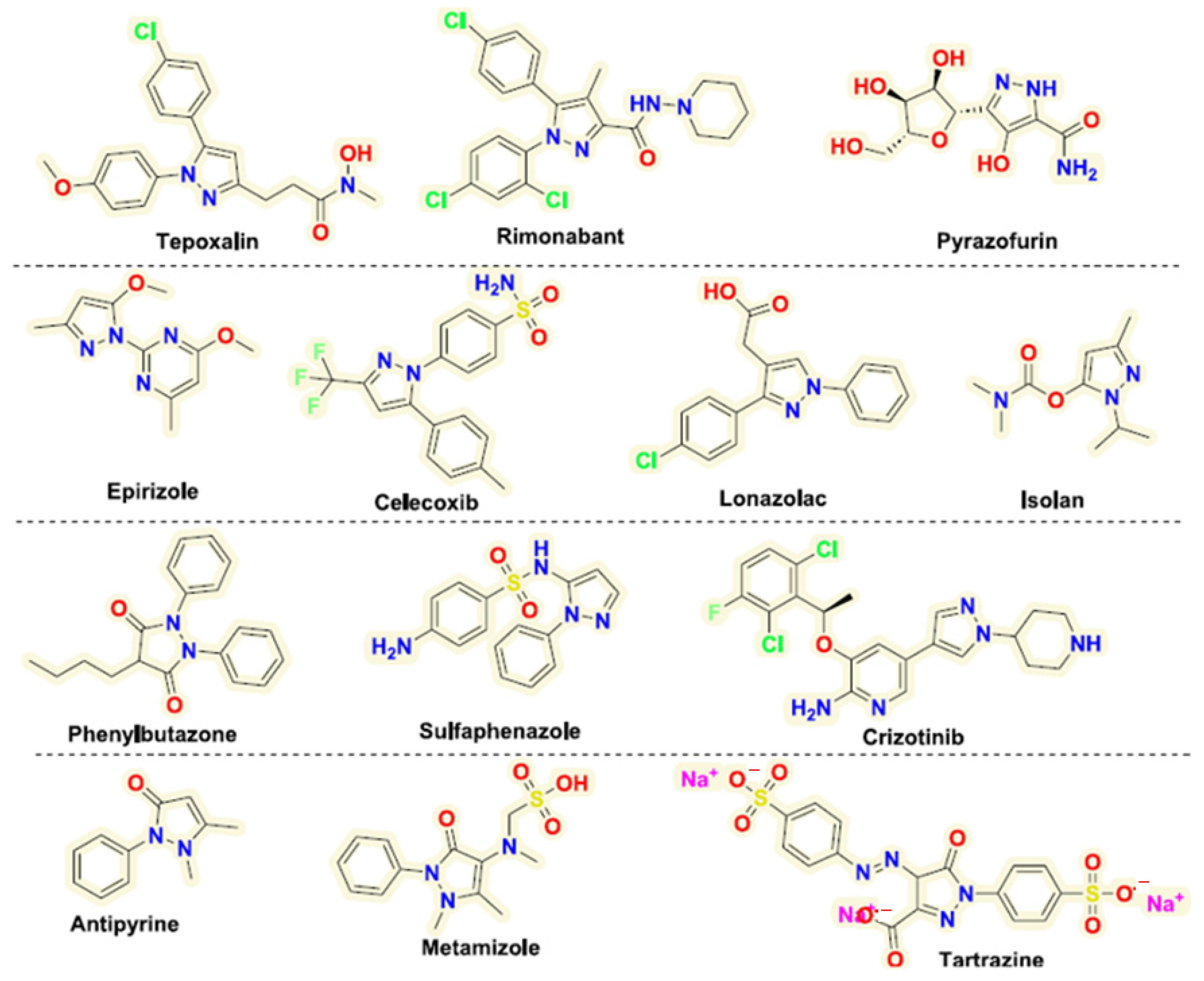 - Bansal, N.; Sathish, E.; Babu, M.A.; Bushi, G.; Gaidhane, A.M.; Singh, T.G.; Singh, D.; Alasiri, G.; Fareed, M.; Kumar, B. Pyrazole in drug development: A medicinal-chemistry based analysis of USFDA-approved drugs in last decade. Mol. Divers. 2025. [Google Scholar] [CrossRef] [PubMed]