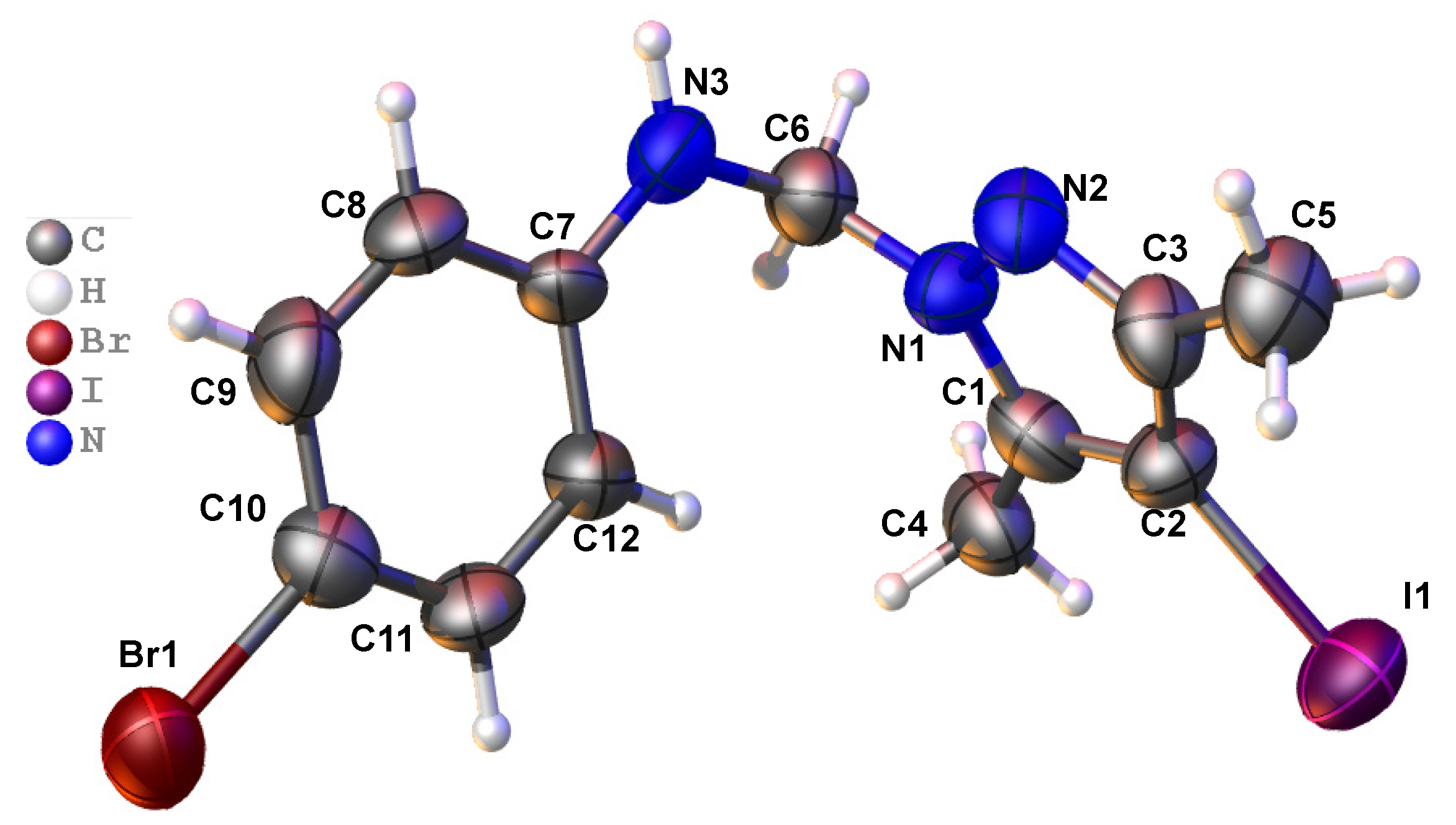 - Hüttel, R.; Schäfer, O.; Jochum, P. Die Jodierung der Pyrazole. Eur. J. Org. Chem. 1955, 593, 200–207. [Google Scholar] [CrossRef]