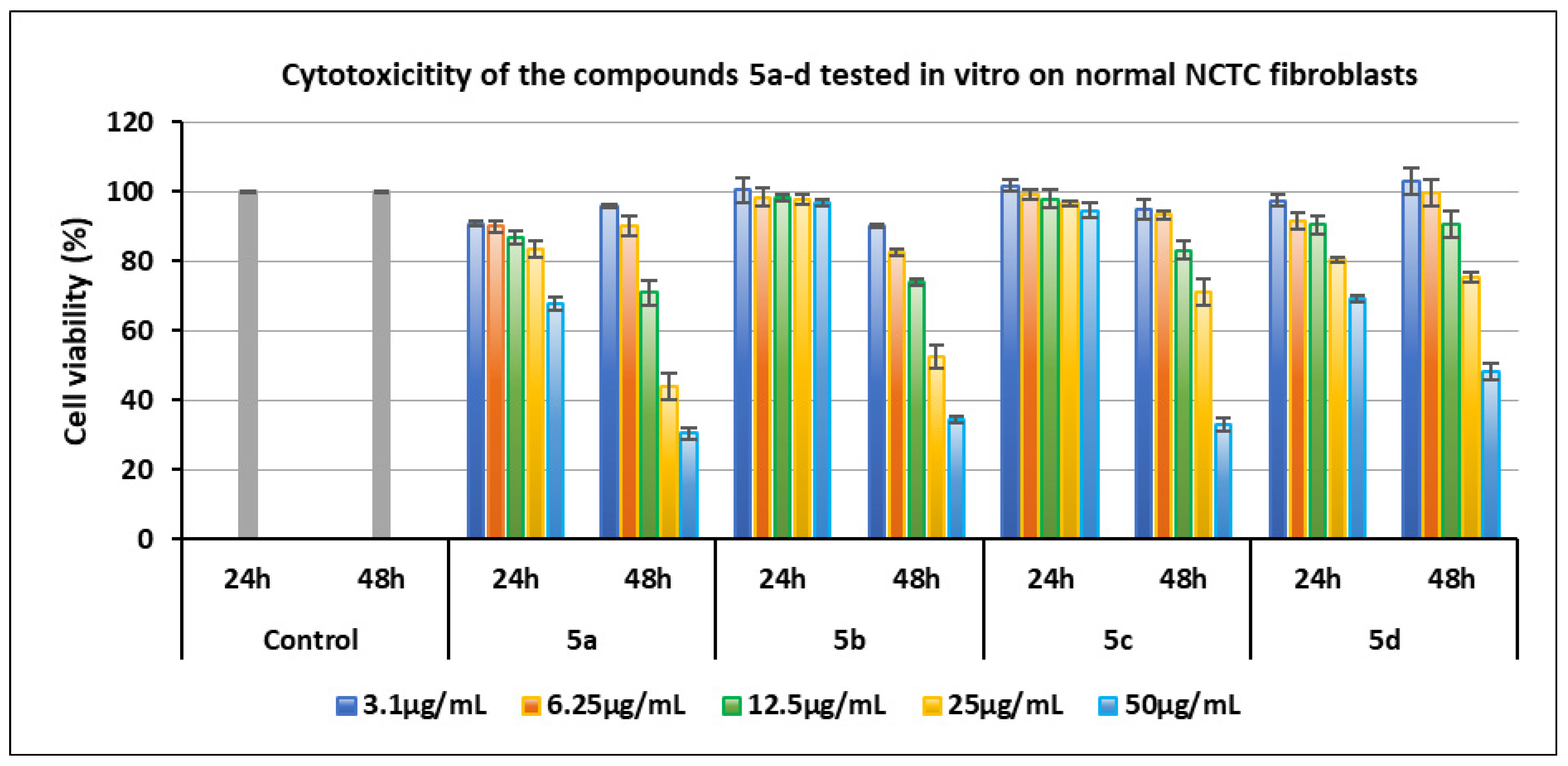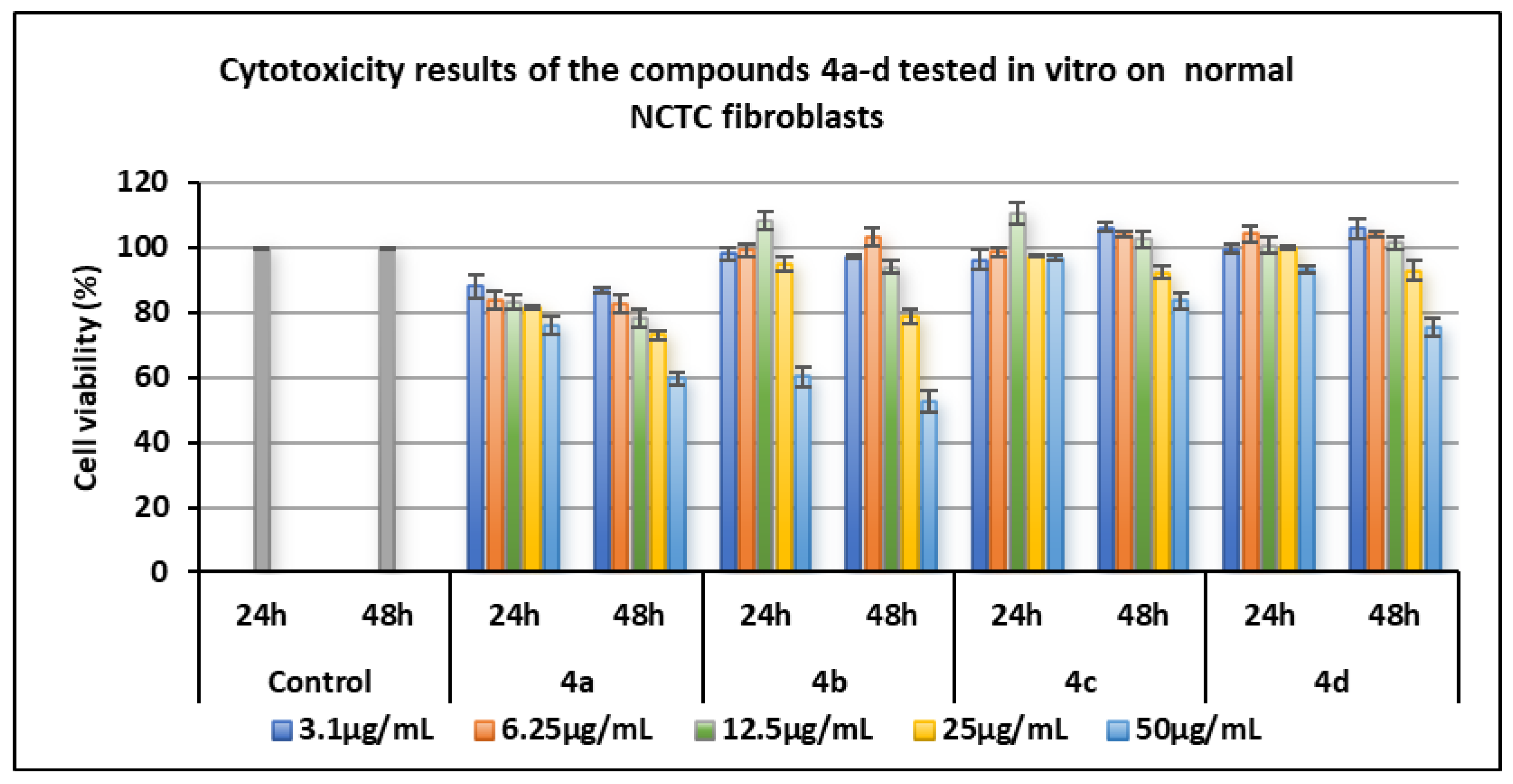- Compound 4c (Br) was the most biocompatible with normal NCTC fibroblast cells at both time intervals and across the entire concentration range, achieving a maximum cell viability of 110.43% at 12.5 µg/mL. It was closely followed by compound 4d (I), which showed comparable values.