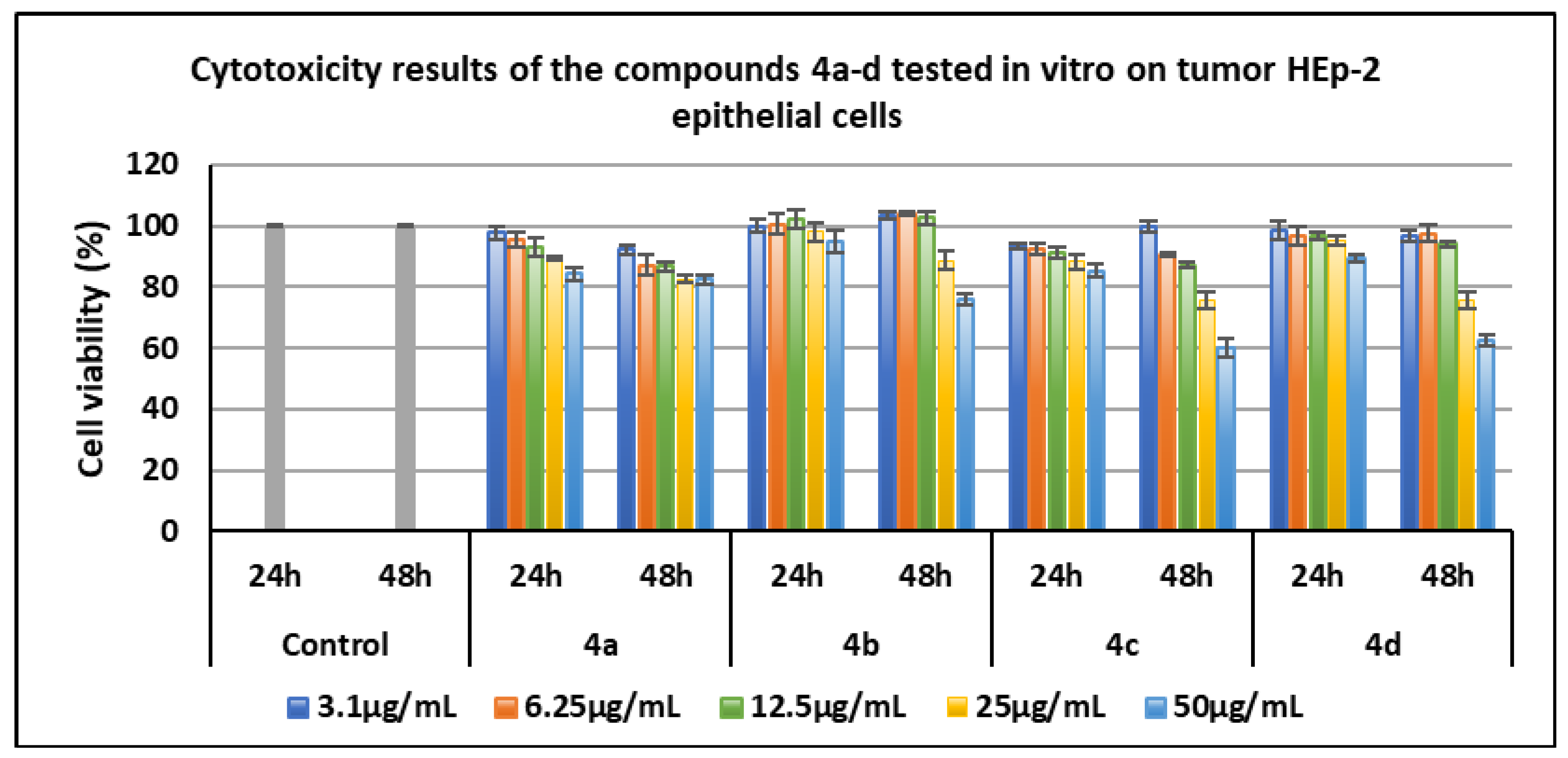- Compounds 6a–c did not show any anti-tumor activity on HEp-2 cells over the tested concentration range. Compounds 6d–g exhibited anti-tumor effects only at the maximum concentration (50 µg/mL), predominantly at 48 h.