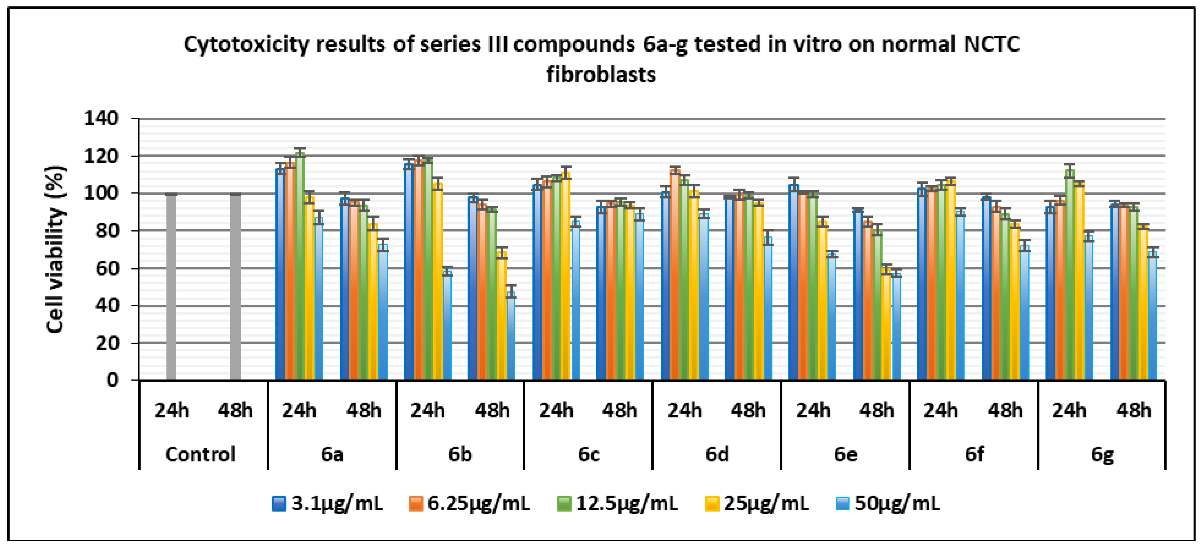 - Compound 6b exhibited pronounced cytotoxicity at 50 µg/mL at both 24 and 48 h, with cell viability of 58.59% and 47.54%, respectively.