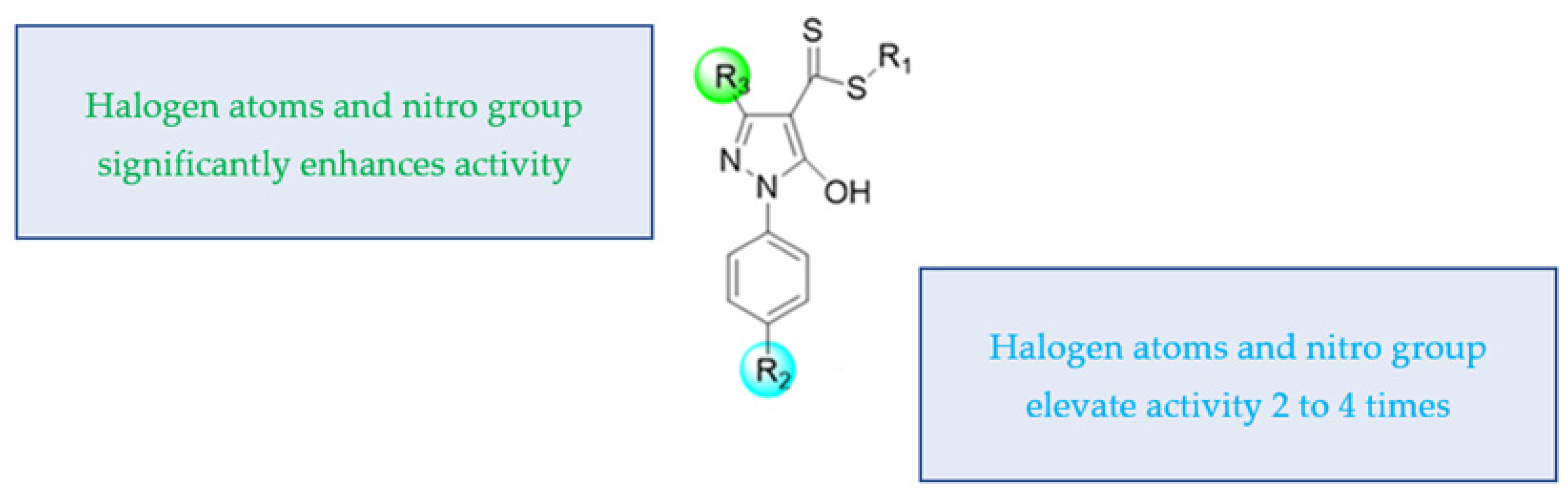 - Majed, H.; Johnston, T.; Kelso, C.; Monachino, E.; Jergic, S.; Dixon, N.E.; Mylonakis, E.; Kelso, M.J. Structure-activity relationships of pyrazole-4-carbodithioates as antibacterials against methicillin–resistant Staphylococcus aureus. Bioorg. Med. Chem. Lett. 2018, 28, 3526–3528. [Google Scholar] [CrossRef]