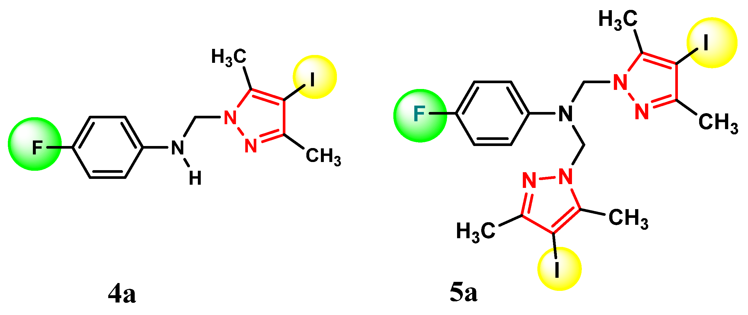 Synthesis of N, N-bis-[(3,5-dimetyl-4-iodo-1H-pyrazol−1-yl)-methyl]-4-fluoroaniline (5a)