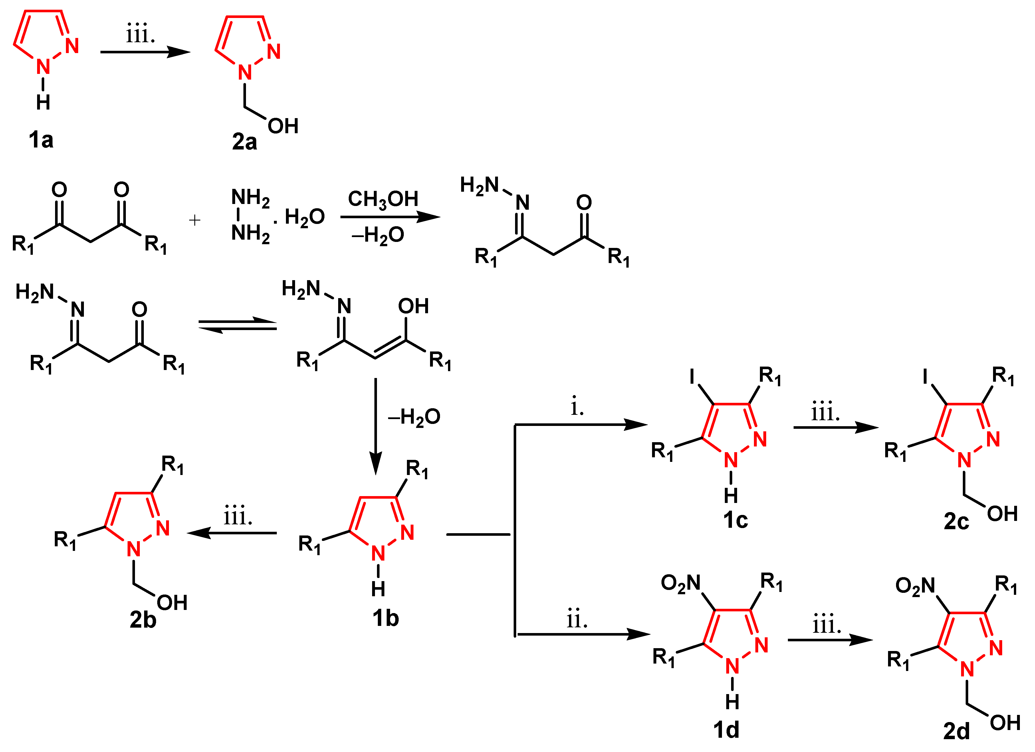 - Dvoretzky, I.; Richter, J.H. Formaldehyde condensation in the pyrazole series. J. Org. Chem. 1950, 15, 1285–1288. [Google Scholar] [CrossRef]
