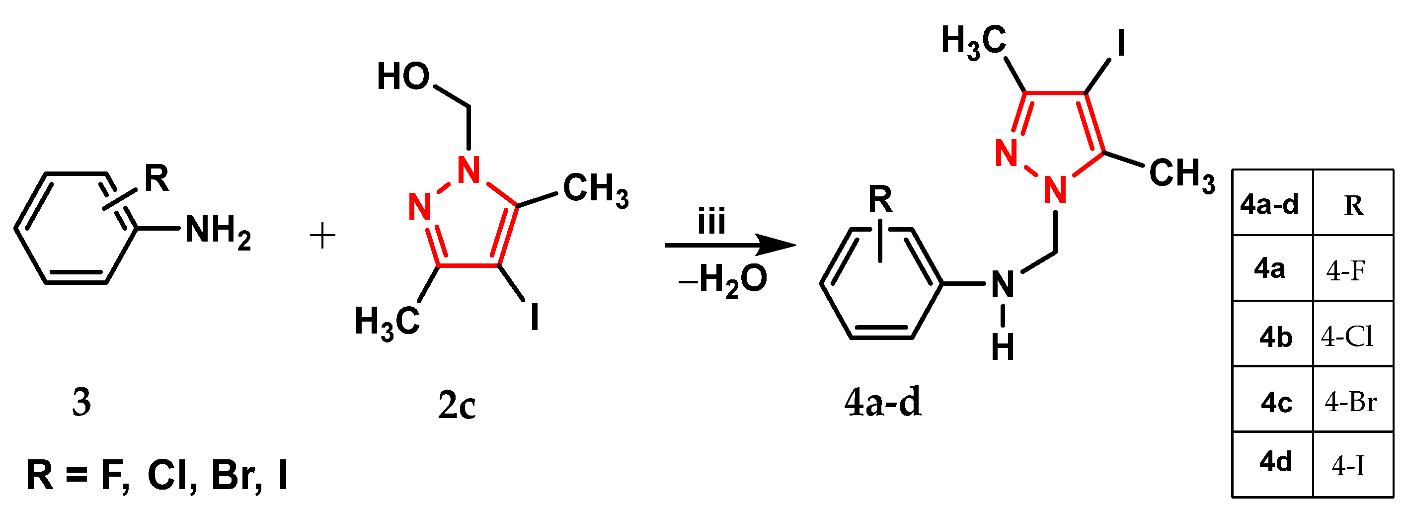 Synthesis of N-[(3,5-dimetyl-4-iodo-1H-pyrazol-1-yl)-methyl]-4-bromoaniline (4c)