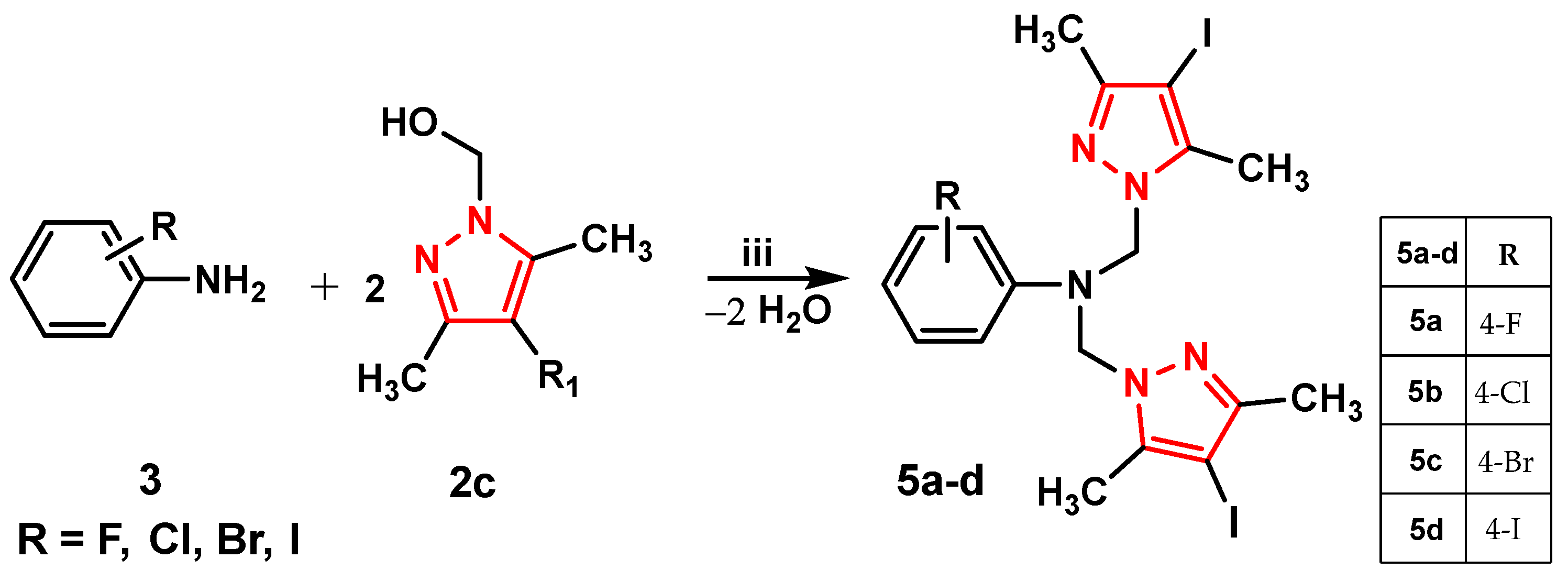 Synthesis of N, N-bis-[(3,5-dimetyl-4-iodo-1H-pyrazol-1-yl)-methyl]-4-bromoaniline (5c)