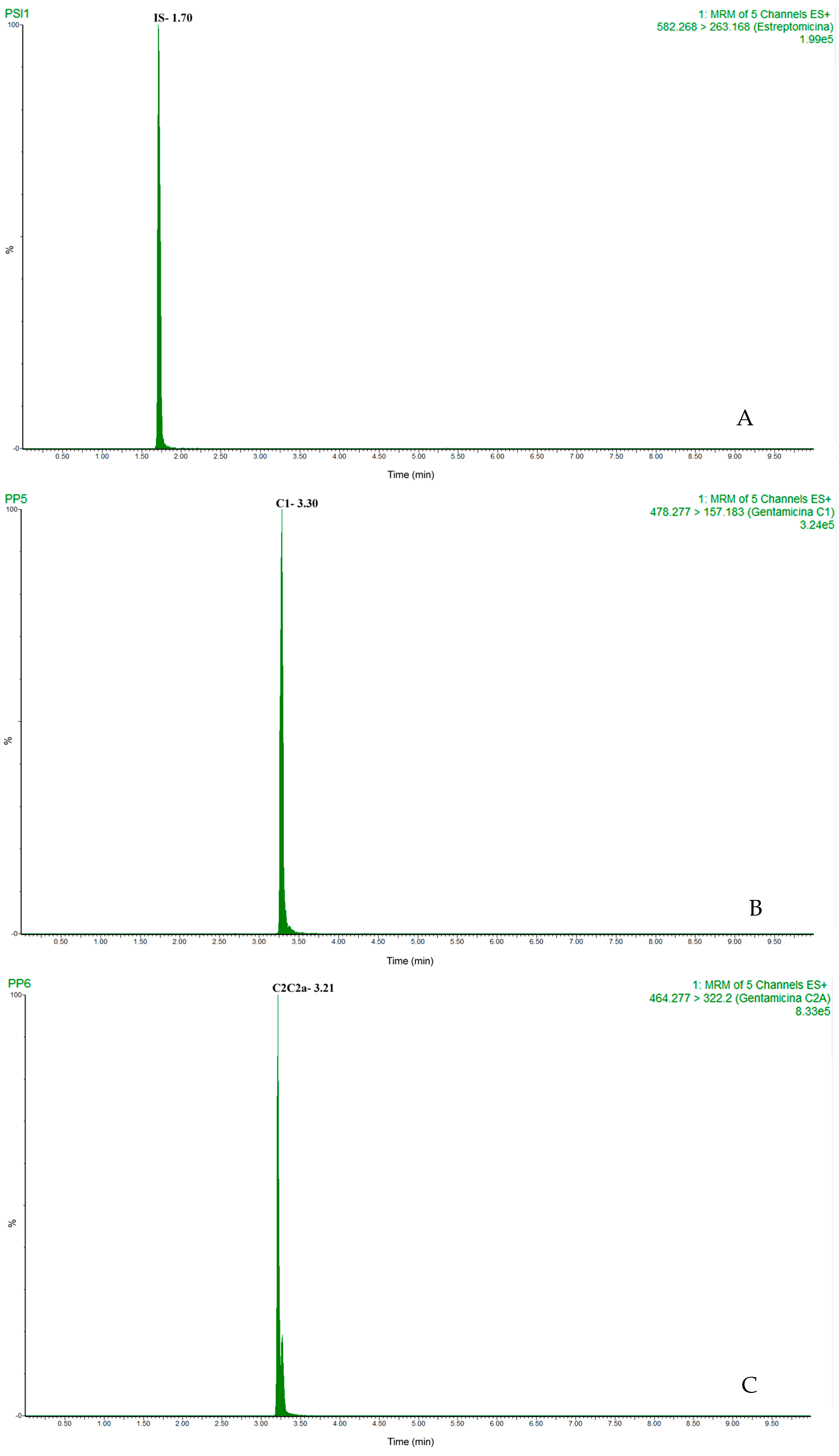- Lecároz, C.; Campanero, M.A.; Gamazo, C.; Blanco-Prieto, M.J. Determination of gentamicin in different matrices by a new sensitive high-performance liquid chromatography-mass spectrometric method. J. Antimicrob. Chemother. 2006, 58, 557–563. [Google Scholar] [CrossRef]