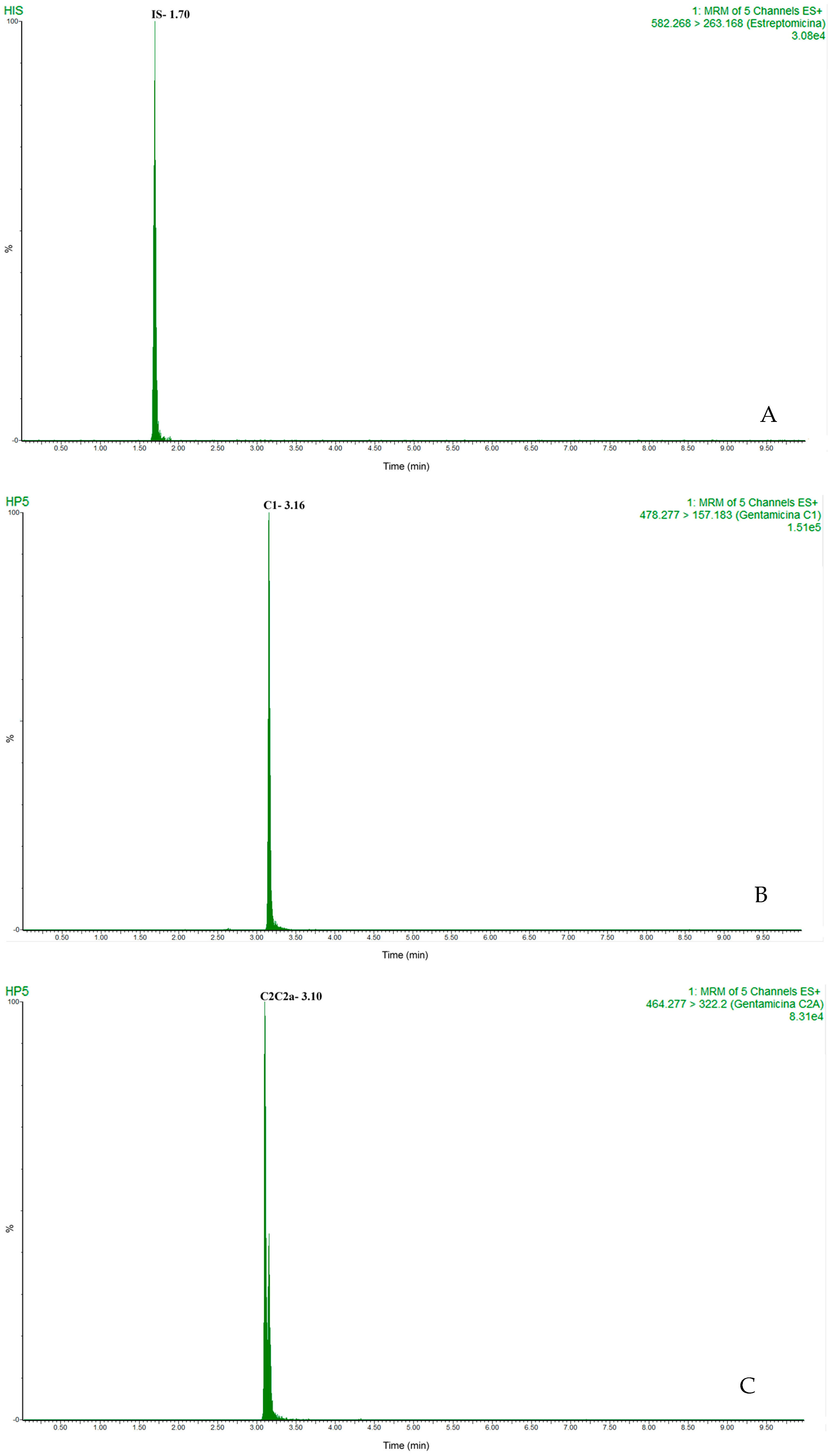 - Zhang, C.; Hu, J.; Sun, F.; Jia, M.; Chen, G.; Wu, C.; Zheng, L. Determination of four main components of gentamicin in animal tissues after solid-phase extraction by high-performance liquid chromatography/tandem mass spectrometry. Rapid Commun. Mass Spectrom. 2018, 32, 1766–1772. [Google Scholar] [CrossRef]