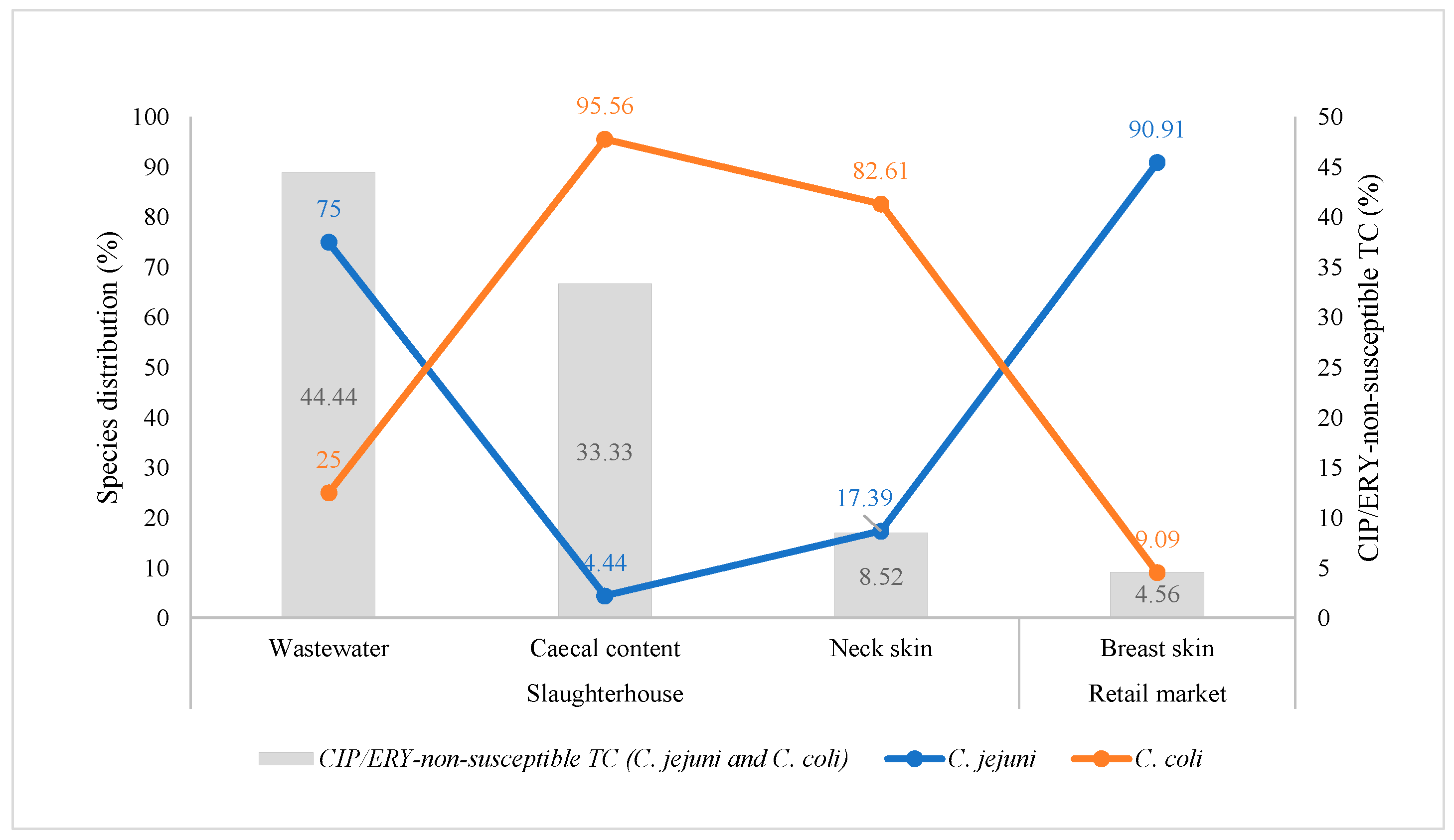 2.1. Presence of CIP/ERY-Non-Susceptible TC at Poultry Slaughterhouses and Retail Markets: Distribution and Minimum Inhibitory Concentrations