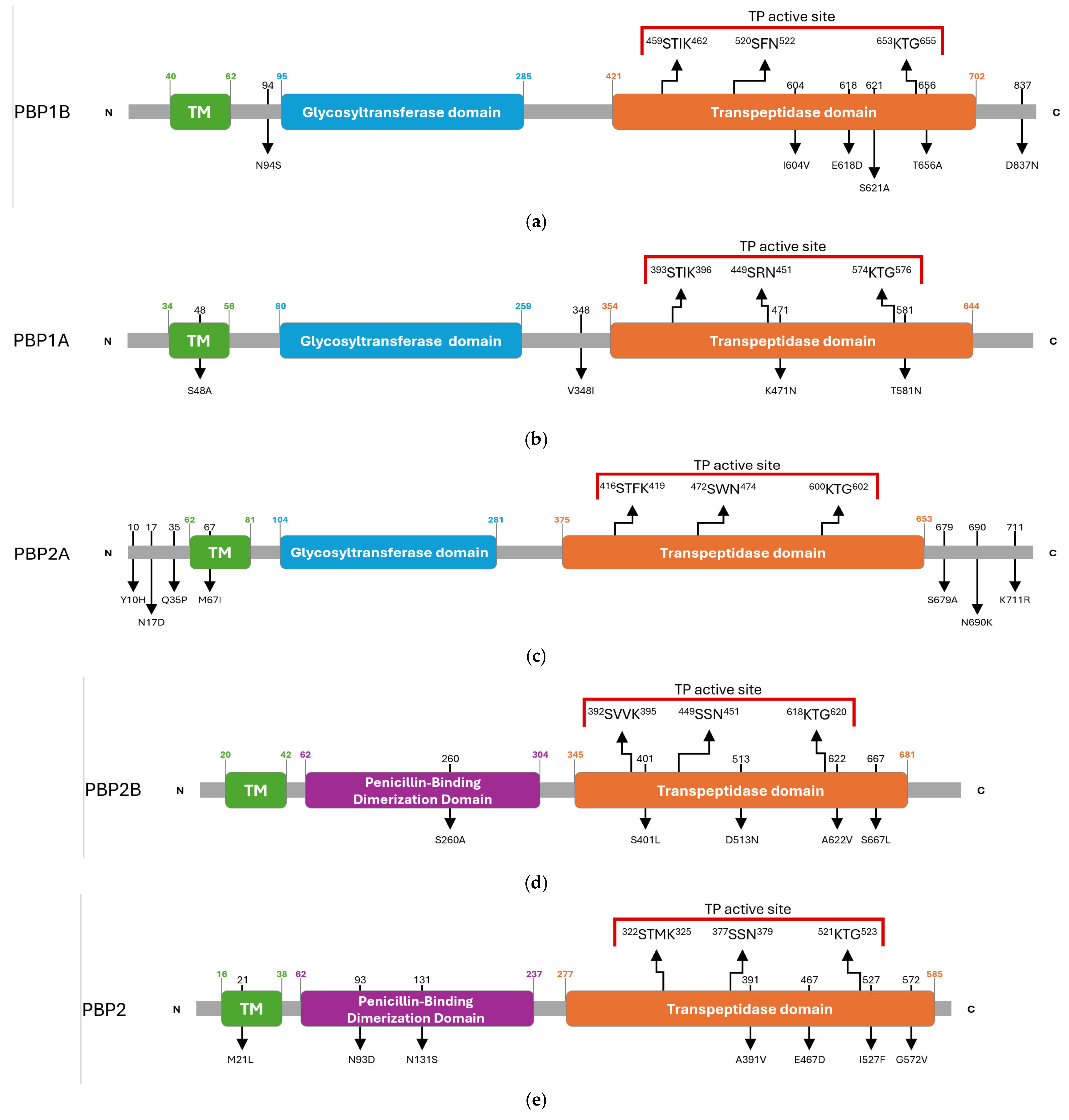 | Subcellular Location | Type | Position | Penicillin-Binding Protein Dimerization | Glycosyl Transferase | Transpeptidase | ||||