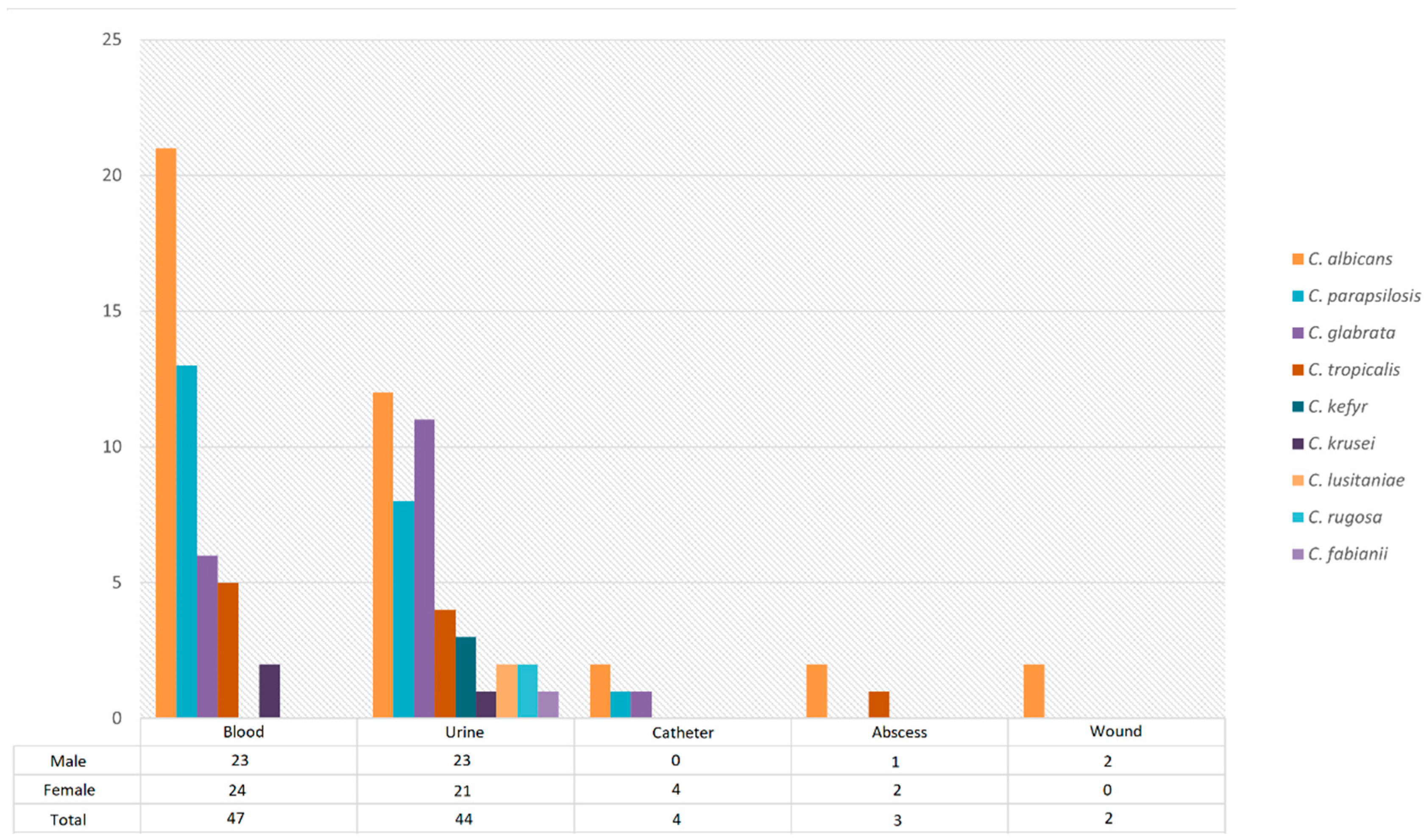| Candida lusitaniae | 3 | Excluded | n < 5, chi-square invalid |