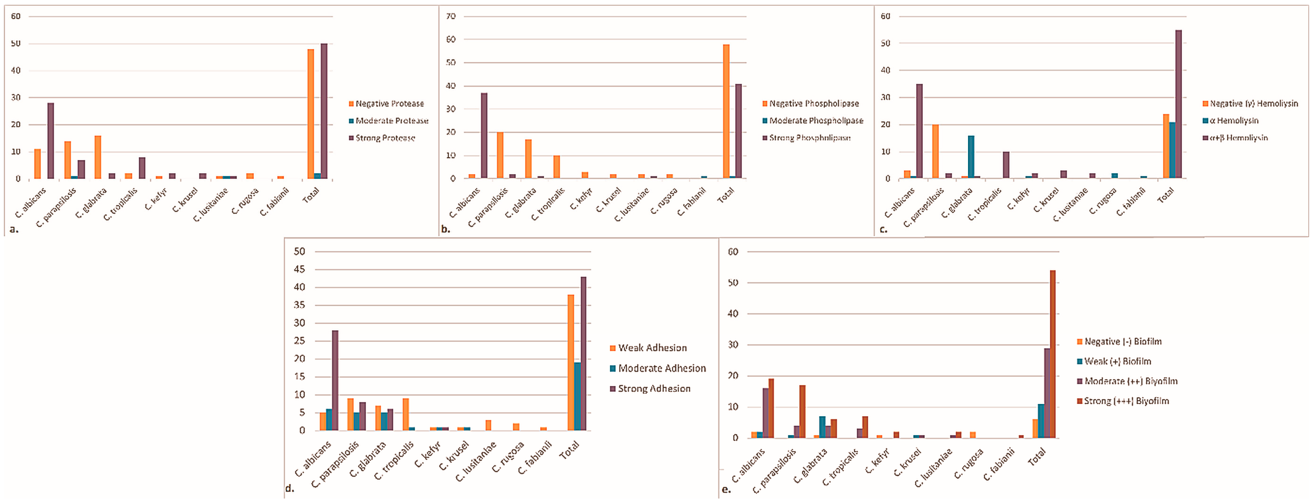 - Dabiri, S.; Shams-Ghahfarokhi, M.; Razzaghi-Abyaneh, M. Comparative analysis of proteinase, phospholipase, hydrophobicity and biofilm forming ability in Candida species isolated from clinical specimens. J. Mycol. Med. 2018, 28, 437–442. [Google Scholar] [CrossRef]
