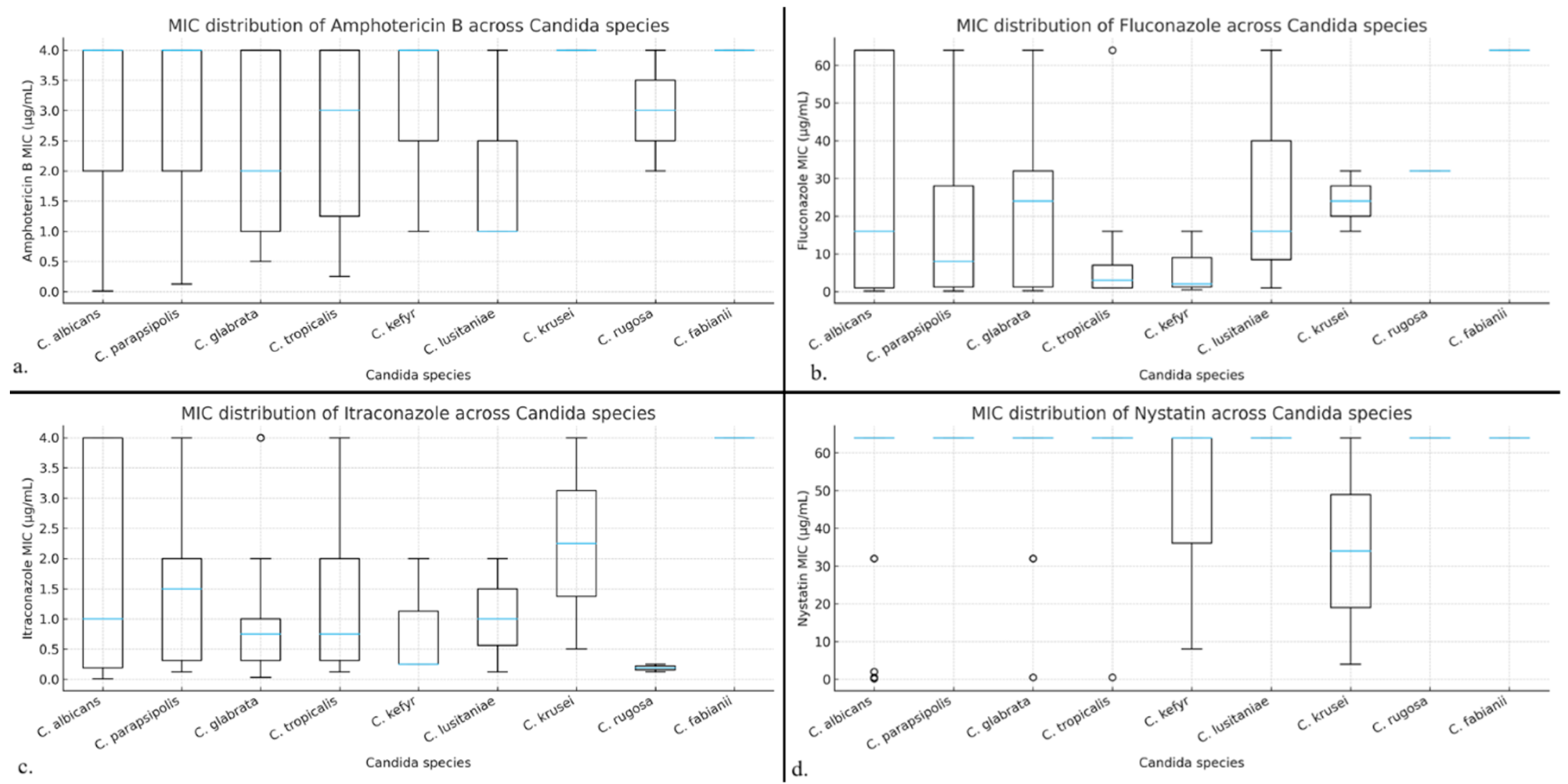 | Candida kefyr | 3 | Excluded | n < 5, zero MIC variance |