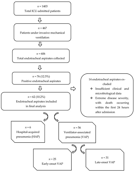 The final study cohort consisted of 62 patients with positive endotracheal aspirate cultures, each contributing a single infectious episode. Of the 62 enrolled patients, 9.7% (n = 6) were diagnosed with hospital-acquired pneumonia (HAP) and 90.3% (n = 56) were diagnosed with ventilator-associated pneumonia (VAP). Among VAP cases, 44.6% (n = 25) were classified as early-onset VAP, whereas 55.4% (n = 31) were late-onset VAP.