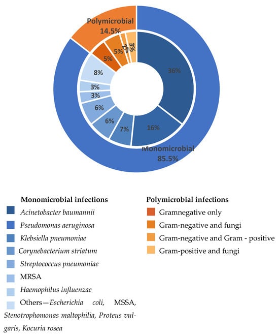 The outer ring illustrates the overall proportion of monomicrobial and polymicrobial infections. The inner ring reflects the distribution of causative agents identified in monomicrobial infections (blue shades) and the main polymicrobial associations (orange shades). Percentages displayed in the inner ring are calculated relative to the total number of monomicrobial infections and the total number of polymicrobial infectious episodes, respectively. “Others” includes less frequently isolated pathogens, each identified in a single case, and grouped for clarity: MSSA—methicillin-susceptible Staphylococcus aureus; MRSA—methicillin-resistant Staphylococcus aureus.