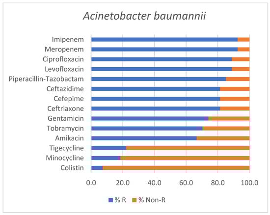 Antimicrobial susceptibility profile of Acinetobacter baumannii isolates identified in positive endotracheal aspirates. Bars represent the percentage of resistant (% R) and non-Resistant (% Non-R) strains for each tested antimicrobial agent.