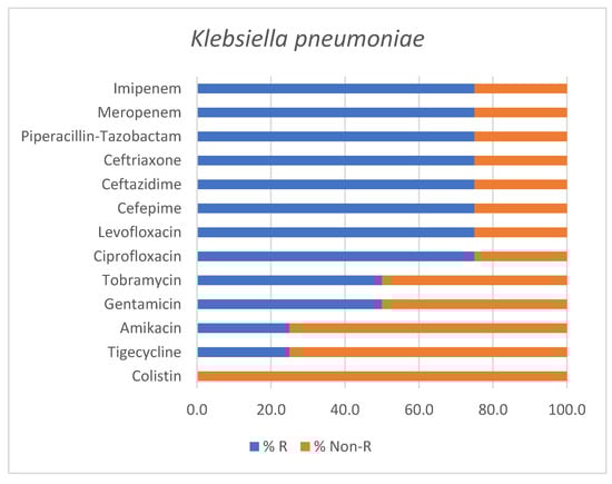 Antimicrobial susceptibility profile of Klebsiella pneumoniae isolates identified in positive endotracheal aspirates. Bars represent the percentage of resistant (% R) and non-Resistant (% Non-R) strains for each tested antimicrobial agent.
