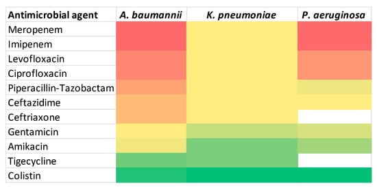 Among all Acinetobacter baumannii isolates (n = 27), resistance rates were particularly elevated, with six strains being classified as MDR, 15 strains as XDR and three strains as PDR, respectively. Only three isolates exhibited resistance patterns that did not fulfill the criteria for multidrug resistance, being reported as non-MDR.
