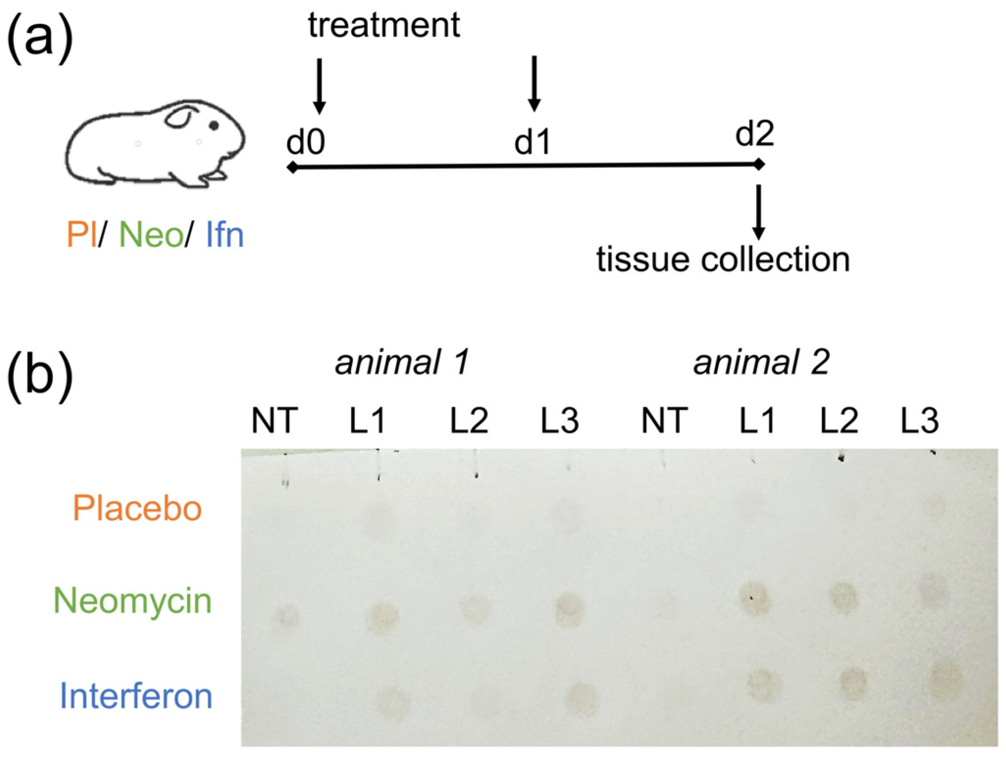 The study included 6 animals (n = 2 per group). Animals in the neomycin group were administered 5 mg/animal/day neomycin sulfate (ZAO Agropharm, Voronezh, Russia). Animals in the negative control (placebo) group received phosphate-buffered saline (PBS; Biolot, Saint-Petersburg, Russia). Animals in the positive control group were administered 250,000 U/animal/day of IFNα (AO Vector-Medica, Kol’tsovo, Russia). The drugs/placebo were administered intranasally on day 0 and day 1, at a volume of 50 μL per animal. On day 2, all animals were euthanized, and nasal turbinates (NT) and lung lobe tissue (L1–L3) were collected. Tissue samples were homogenized in PBS using 3 mm steel beads and a Tissue Lyser homogeniser (Qiagen, Germantown, MD, USA) for the subsequent dot blot analysis of Mx expression.