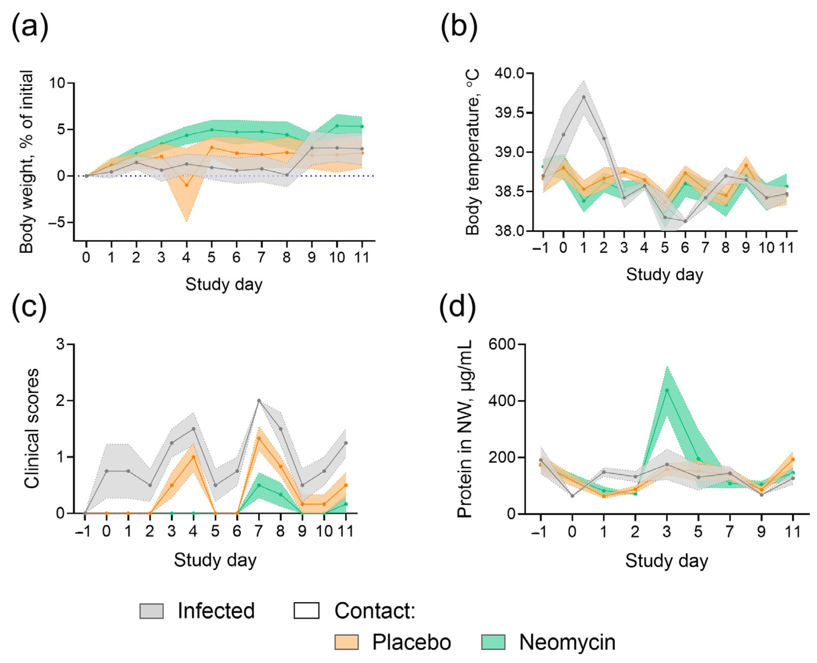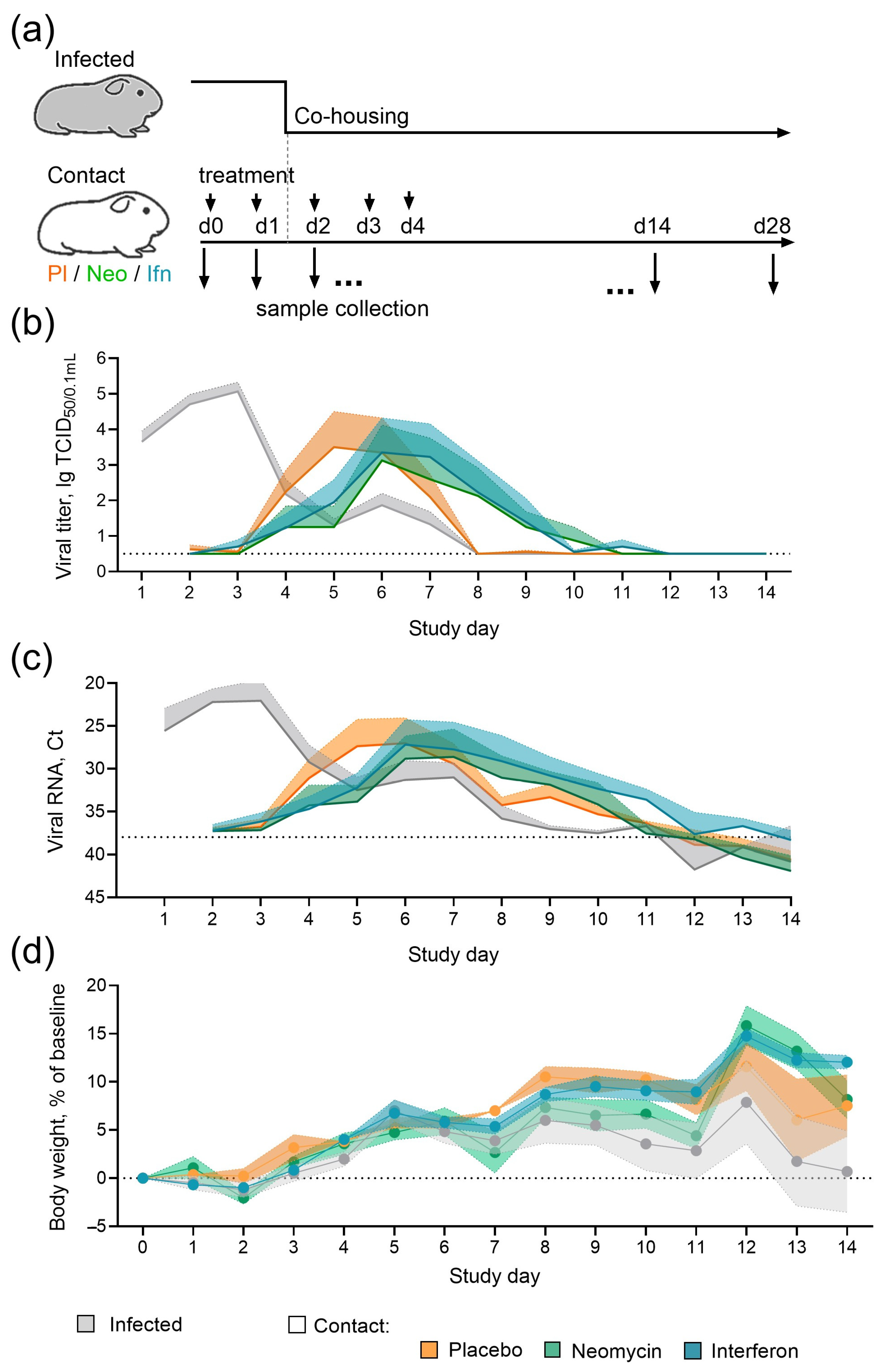 Figure 2. Effect of neomycin on influenza B virus transmission in guinea pigs. (a) Experimental timeline. (b) Infectious influenza virus titers in nasal swabs. (c) Influenza B virus RNA levels in nasal swab samples; Ct, real-time RT-PCR threshold cycle. Panels (b,c) show the dynamics of mean values with the upper range of the standard error of the mean (SEM; n = 6 for infected animals, n = 4 for contact animals). The dotted line indicates the detection limit. Individual data are presented in Appendix A Figure A1. (d) The dynamics of changes in guinea pig body weight, with mean values and SEM (n = 6 for infected, n = 4 for contacts).