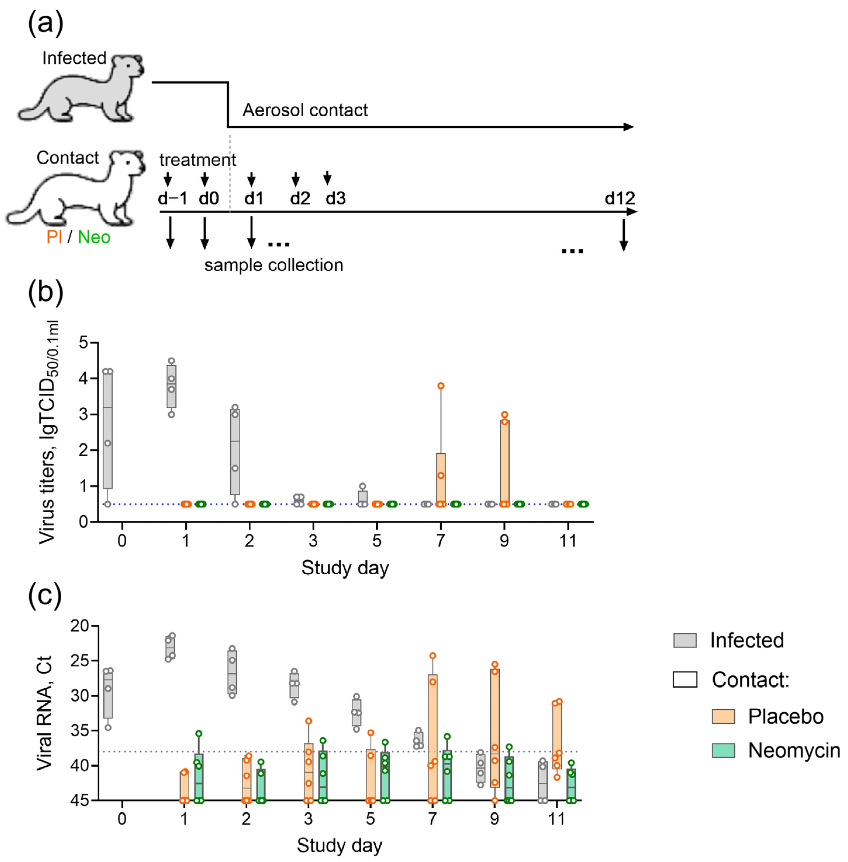 Figure 3. Effect of neomycin on influenza B virus transmission in ferrets. (a) Experimental timeline. (b) Infectious influenza virus titers in nasal wash samples. (c) Influenza B virus RNA in nasal wash (NW) samples; Ct, real-time RT-PCR threshold cycle. Individual values and summary statistics are presented in boxplots. The dotted line indicates the detection limit.