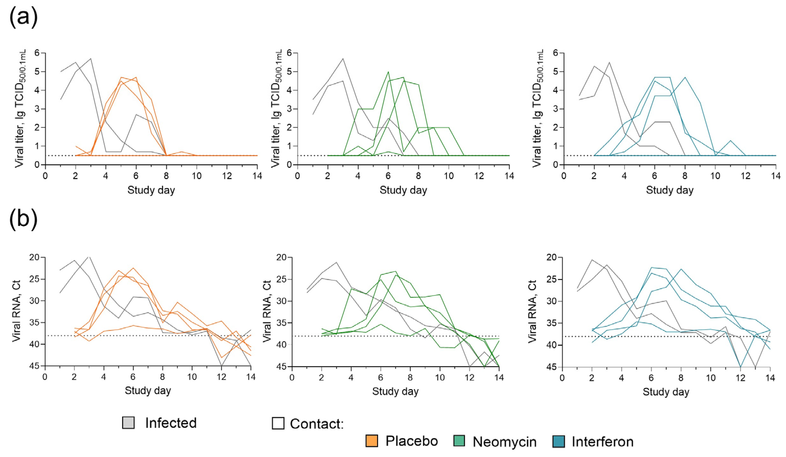 Figure A1. Effect of neomycin on influenza B virus transmission in guinea pigs (individual data). (a) Infectious influenza virus titers in nasal washes. (b) Influenza B virus RNA in nasal wash samples. Data from each guinea pig are shown by a separate line. The dotted line indicates the detection limit.