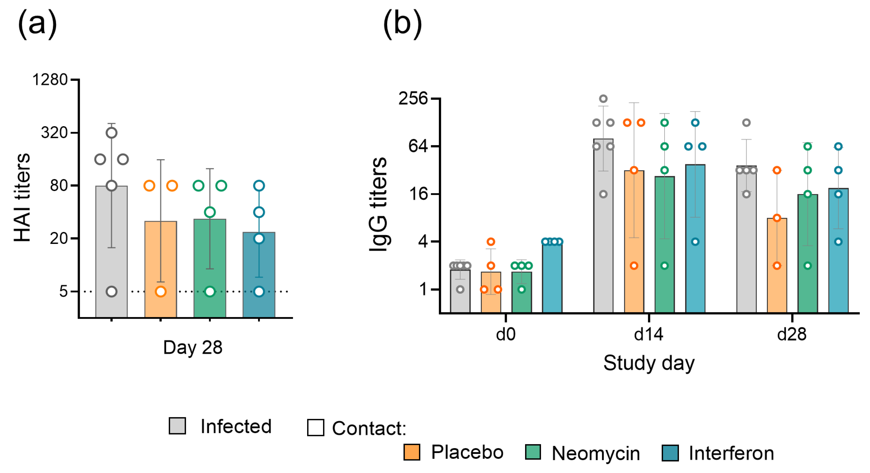 Guinea pigs were chosen as a conventional small animal model of contact influenza transmission [14,15,16] to assess the ability of neomycin to reduce susceptibility to infection, similarly to recombinant IFNα [21] that served as a control in this experiment. Guinea pigs were pre-treated intranasally with neomycin, IFNα, or placebo and then placed in contact with infected animals (Figure 2a). During the 14-day contact period, two treated guinea pigs were co-housed with one infected animal (ratio 2:1). Animals from the infected group were inoculated intranasally with influenza B/Washington/1/2019 virus one day before the contact.