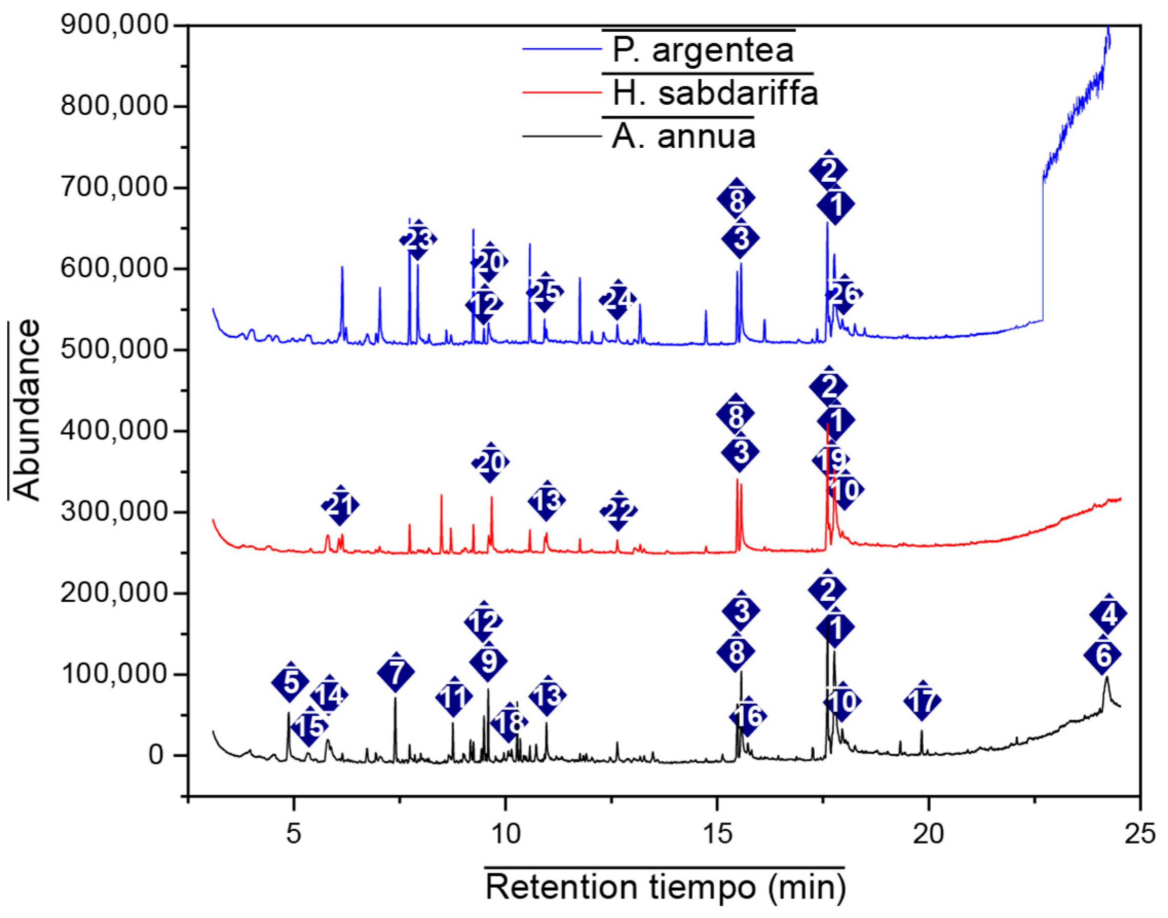 | 1 | Oleic acid![]() | A. annua (20.20) H. sabdariffa (20.29) P. argentea (11.77) | Antioxidant, anti-inflammatory, antitumor, immunostimulant, antiandrogenic, antibacterial, antifungal, acts as a lubricant, binder, anti-foaming agent, important factor in the hypoglycemic effect, pharmaceutical solvent | [26,27,28,29] |