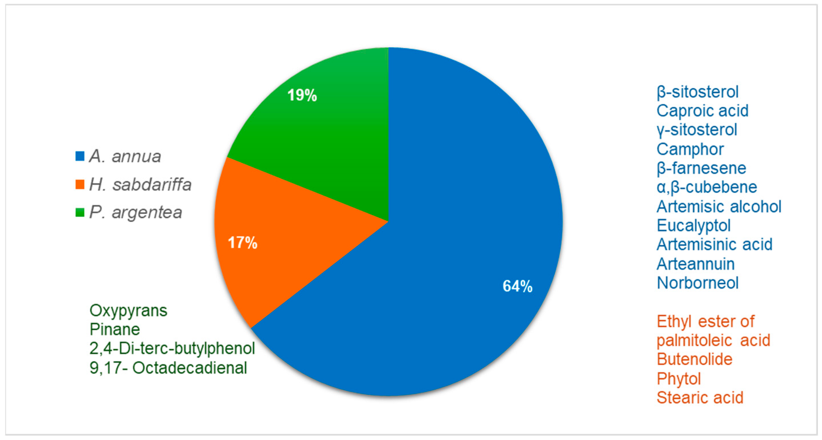 | 3 | Palmitic acid![]() | A. annua (6.19) H. sabdariffa (10.67) P. argentea (7.16) | Lubricant, binder, antifoaming agent, disinfectant, antioxidant, anti-inflammatory, hypocholesterolemic, antiandrogenic, antibacterial, antifungal | [29,31,32,33,34] |