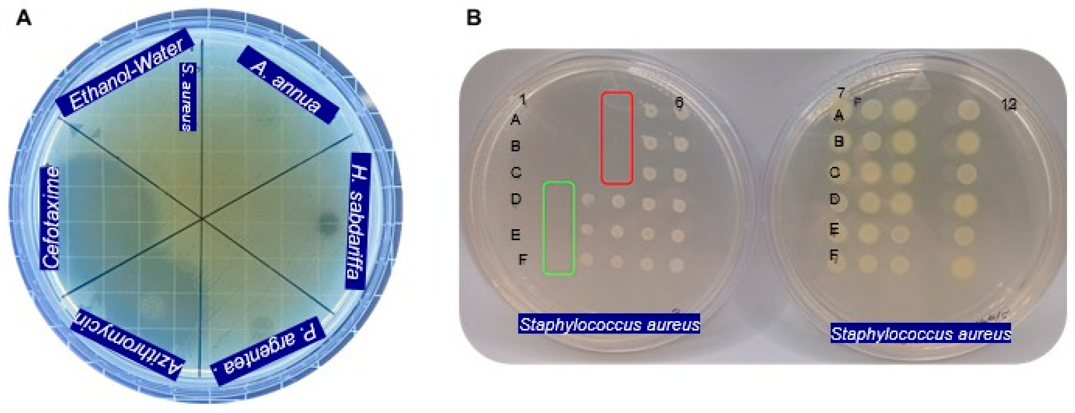 - Bordean, M.E.; Ungur, R.A.; Toc, D.A.; Iancu, M.L.; Pop, A.D.; Scurtu, I.C.; Pop, C.P.; Cozma-Petruţa, A.; Helepciuc, M.F.; Loghin, F. Antibacterial and Phytochemical Screening of Artemisia Species. Antioxidants 2023, 12, 596. [Google Scholar] [CrossRef] [PubMed]